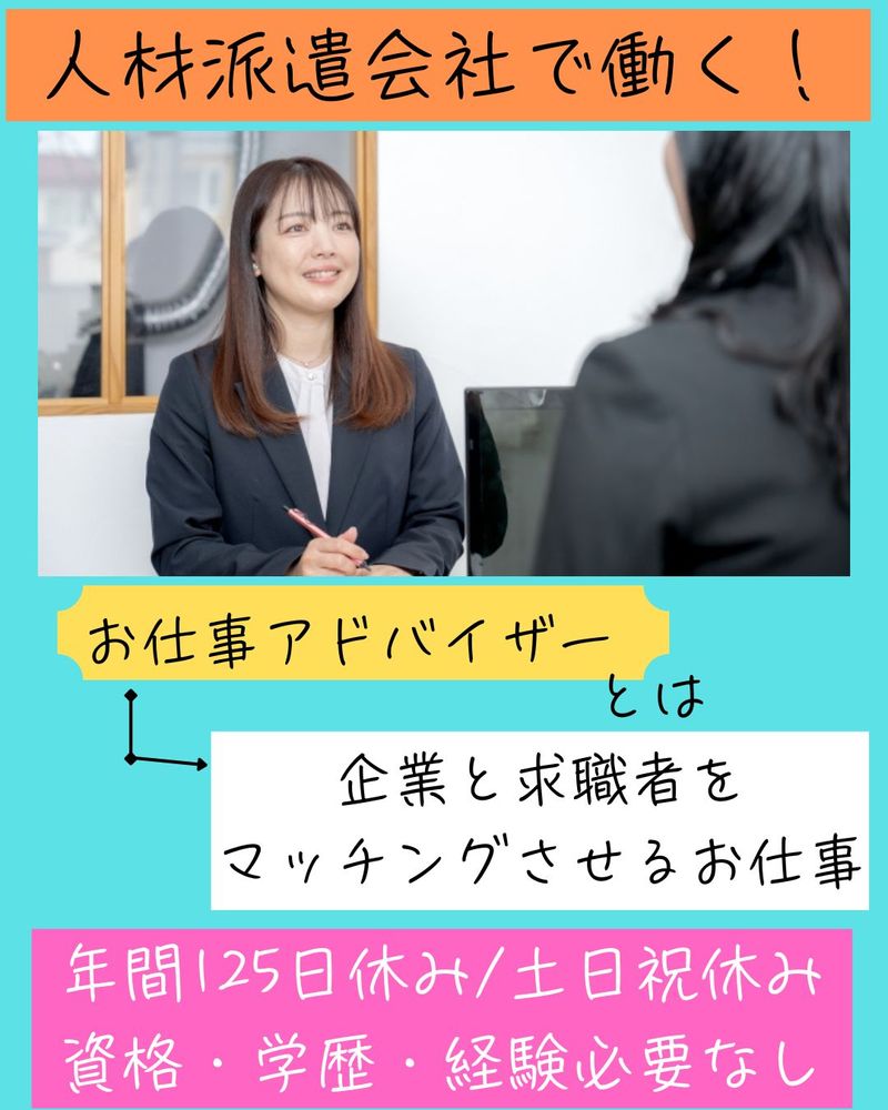 メッセージ ◎年間125日休み ◎土日祝休み ◎残業なし ◎勤務先は「新下関」駅より徒歩15分 (車通勤可・マイカー通勤可・駐車場あり) ◆―――――――――◆ 『お仕事アドバイザー』 『キャリアアドバイザー』とは、 企業とお仕事を探されている求職者を 繋げるお仕事です! ◆―――――――――◆ 【やりがい】 ・求職者の人生の転機をサポートし 希望するキャリア実現に 貢献できる! ・また、企業と求職者を成功に導くことで 双方から感謝され 社会貢献を実感できることも 大きな魅力! また、多種多様な人々と関わる中で 自身のスキルアップや 成長を実感できることも やりがいにつながる! ―――――――――――――― ◎PCの基本操作ができれば 学歴・経験・資格すべて問いません! ▽▽▽▽▽▽▽ ☆こちらのお仕事は、 企業様からお預かりし 転職エージェント『しごと計画学校』が ご紹介するお仕事です 『しごと計画学校』については 下記「その他欄」に記載しておりますので ご参考ください 土日祝休み/年間125日休み今までの経験・資格・学歴一切問いません!やりたい気持ちを応援します(^^)/ 職業紹介事業(35-ユ-300085) 労働者派遣事業(派35-300431)