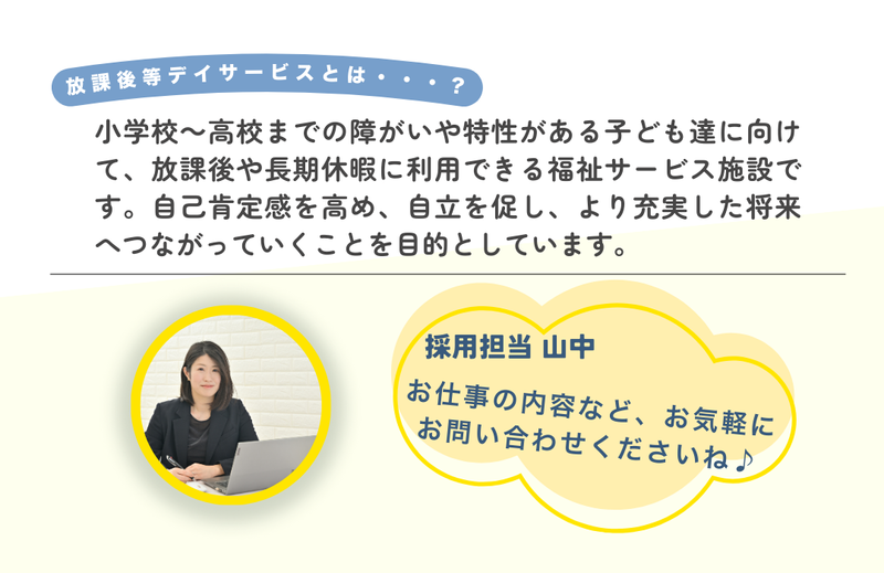 求めている人材 \ 業界未経験者歓迎*フリーター歓迎 / 2年の経験で児童指導員任用資格の取得可能 【 正社員登用あり 】【 第二新卒歓迎 】 【必須】普通自動車運転免許(AT限定可) <こんな方にオススメ> *とにかく子どもが好き! *障がい者支援や福祉事業に興味がある *誰かの力になれることにやりがいを感じる *未経験から手に職をつけたい *安定して働き続けられる環境がいい \正社員登用制度あり/ ・子どもと関わる仕事に就きたい! ・まずはパートで雰囲気を知りたい! ・自分にもできるか挑戦してみたい! など、応募動機は何でもOKです。 *2年以上の勤務で 「児童指導員任用資格」の取得も可能! -------------------- 下記のことに興味のある方・経験者歓迎  ̄ ̄ ̄ ̄ ̄ ̄ ̄ ̄ ̄ ̄ ̄ ̄ ̄ ̄ ̄ ̄ ̄ ̄ ̄ 放課後等デイサービス、障がい者支援施設 児童養護施設、学童保育、児童発達支援、 保育補助、院内保育士、病院内保育、 病棟保育士など ※上記経験の雇用形態は問いません※ (正社員・アルバイト・パート・ 契約社員・派遣社員・委託社員など) 〇再スタートも応援【第二新卒歓迎】 〇社員登用も目指せる【フリーター歓迎】 〇長期活躍も大歓迎【U・Iターン歓迎】