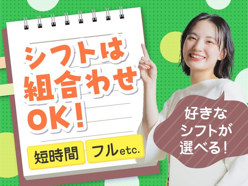 シフト制 勤務時間詳細 【勤務曜日】 月~日の中で週2~5日のシフト制 ※平日のみも相談OK 【勤務時間】 \シフトは自由に組み合わせOK/ (1)9:20~17:30(休憩80分) (2)9:20~20:00(休憩90分) (3)12:00~20:00(休憩80分) (4)14:00~17:30(休憩なし) (5)14:00~20:00(休憩60分) (6)17:30~20:00(休憩なし) 曜日固定でプライベートと両立! 短時間とフルタイムの組み合わせ! 午後シフトメインで働きたい! etc.生活スタイルに合わせて働けます!
