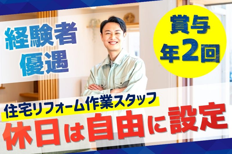 【仕事内容】 住宅のリフォーム作業スタッフを募集します。 ・・ー・・ー・・ー・・ー・・ー・・ー・・ 【おすすめポイント】 ■休日を自由に設定可能! ■産休実績あり!女性スタッフも活躍中 ・・ー・・ー・・ー・・ー・・ー・・ー・・ 【主な仕事内容】 ・住設の交換 ・業者手配(大工・クロス・クリーニング) ・工程管理 ・クロス補修 ・キッチン水栓交換 ・水漏れの修理 ・簡単な床貼り など ※空室やお客様の家での作業で、現場管理が7割・作業が3割です。 あなたのこれまでのご経験が活かせる環境です! 【1日の勤務例】 08:30〜 準備・現場へ移動 09:00〜 現場完了確認・軽作業 11:00〜 移動 12:00〜 休憩 13:00〜 現場完了確認・軽作業 15:00〜 移動 16:00〜 現場完了確認・軽作業 17:30〜 移動 18:30〜 退社 【会社紹介】 社員数11名と決して大きな組織ではありませんが、風通しが良く、年齢や社歴に関係なく冗談も飛び交う、あたたかく居心地の良い職場です。 20代~40代の若手・中堅スタッフが中心で、穏やかで親切な人が多く、仕事の質問にも丁寧に対応してくれます。 現在は「10年後に売上10倍・40億円達成」を目標に、リフォームを軸に不動産や専門職領域にも力を入れ、事業を拡大しています! また、月8日の希望休制度で連休もOK。旅行や趣味も楽しめる柔軟な働き方が可能です。 BBQや忘年会などレクリエーションもあり、景品に大型TVが登場することも! 「何をするか」も大切ですが、長く働くうえで「誰と働くか」も同じくらい重要。 挑戦を支え合える仲間がそろっているからこそ、未来に向かって前向きに歩める――そんな環境がここにあります。 ✅経験をそのまま武器にできる 現場管理7割・作業3割のバランスで、施工経験を活かしながら無理なく働ける環境です。裁量あるポジションで、すぐにご活躍いただけます。 ✅キャリアの次のステージへ これまでのリフォーム経験を活かしながら、工程管理や業者手配など幅広く関われるのが魅力。希望休制度で働き方も柔軟に調整可能です! ✅少数だからこそ得られる充実感 少数精鋭の現場で裁量を持って働ける環境。スタッフ同士の距離も近く、成長を実感しながらスキルアップを目指せる職場です。 ✅会社見学・1日体験入社を実施しています。 いきなりで不安な方は、まずは会社見学からお待ちしております! また1日体験入社も可能です。もちろん給与支給あり! ご連絡・ご応募をお待ちしております。 【求人ID-SGO】