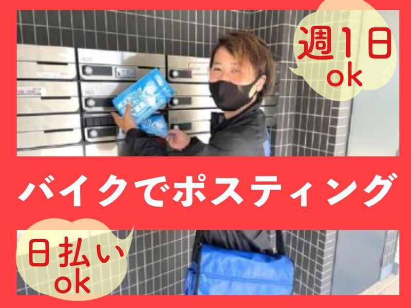 仕事内容 「好きなことを続けながら稼げる!」 *30~40代スタッフ活躍中 ================= この仕事の魅力 ================= ・活動と両立しやすい完全希望シフト制! →「オーディションが入った」「ライブがある」などの予定も柔軟に調整◎ ・派手な格好でも大丈夫! →「イメージを崩さず働ける」と好評です★ ・安定収入を得られる! →日払い・週払いもOK!(規定あり) あなたの働き方で★ …本業が忙しい期間は少なめ勤務 …稽古やライブがない日はしっかり勤務! …オーディション前はお休み! ================= 【1週間ごとシフト提出】で自由に勤務! 未経験歓迎・ポストへのチラシ配布 ================= 日払い・週払いOK(規定) 担当エリアでのポスティング業務のお仕事。 エリアまでは原付で向かうので 原付バイクの免許があればOK! ※原付バイクレンタル可(規定)! ================= ポスティング業務の流れ ================= 相模原営業所で指示書とチラシを受け取る ↓ 原付バイクで出発 ↓ 担当エリアに到着! 現地写真を撮って【業務スタート】 ★ポスティング ・マンションなどのポストにチラシ投函 ・4時間~8時間でチラシ配布 (早めに配り切っても終了) ↓ 営業所に戻って業務報告・終了 【POINT】 配布は相模原市、町田市、八王子市、多摩市、大和市、厚木市などになります。 「○枚○円」という歩合制ではなく時間制なので、安定収入GET♪ ★稽古やライブと両立しながら、確実に収入を得られます! ================= スキマバイトに!? WワークOK/完全希望自由シフト ================= ★週1日~、1日4時間~OK! シフトは1週間ごとの提出だから、 あなたの予定に合わせて柔軟に調整可能。 「今週は稼ぎたい!」も、 「来週はシフト少なめに…」もOKです。 勤務日数の相談もしやすいからこそ、長期で続いているという人多数! 例えば2週に1回しか入れない…というときがあってもいいんです。 【長く一緒に勤めてくれること】これを大切にしています! ※バイク貸し出しあり ================= こんな方が活躍中! ================= ・役者志望で活動と両立している方 ・音楽活動を続けながら働く方 ・自分の時間を大切にするフリーター → 髪型・髪色自由だから、イメージを崩さず働けるのも魅力です!