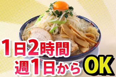 お仕事内容 【「午前中だけ」「夕方だけ」短時間勤務OK】 週1日勤務&1回2時間~の空き時間の有効利用! お子さんが家にいないスキマ時間に 学校が終わった後の夕方数時間 授業のない空いている日中の時間 そんな時間を活用しませんか? 【あなたにお任せするお仕事】 ■食材の仕込み ■盛り付けなど簡単な調理と補助 ■食器、調理器具の洗浄 などのラーメン店での調理業務 受動喫煙対策:屋内原則禁煙