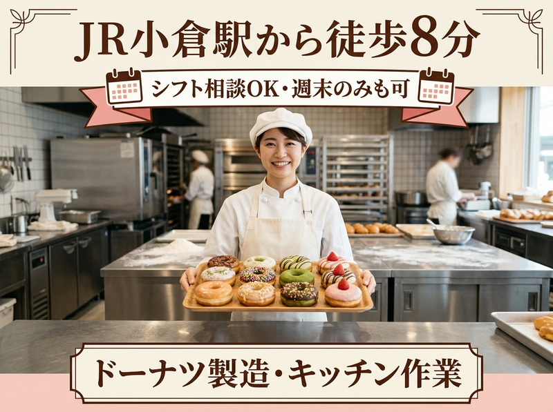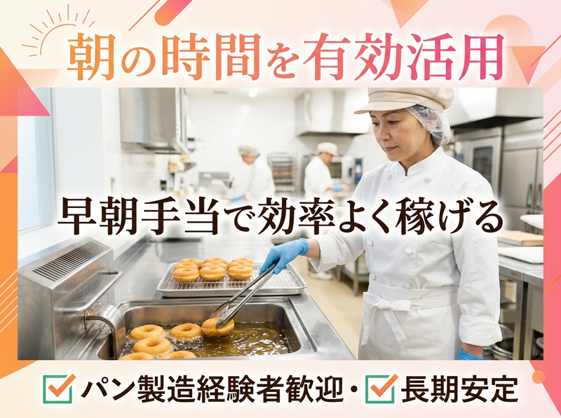 仕事内容 ミスタードーナツ店舗での ドーナツの製造(キッチン作業)を担当していただきます。 ⏩早朝からドーナツを作り、開店に向けて準備をするお仕事です。 【具体的には】 ⭐ドーナツ生地の仕込み ⭐生地の成形(リング状などに加工) ⭐フライヤーでの揚げ作業 ⭐チョコ・シュガーなどのトッピング仕上げ ⭐商品の仕分け・陳列準備 ⭐製造スペースの清掃 最初は簡単な工程からスタートし、 慣れてきたら少しずつ作れる種類を増やしていきます。 ドーナツづくりは技術を覚えるまで少し時間はかかりますが、 先輩スタッフが丁寧に教えるので未経験の方でも安心して始められます。 ⏩パン製造・お菓子作りなど 食品製造の経験がある方はスキルを活かして働けます。