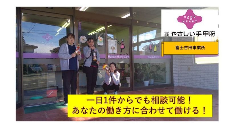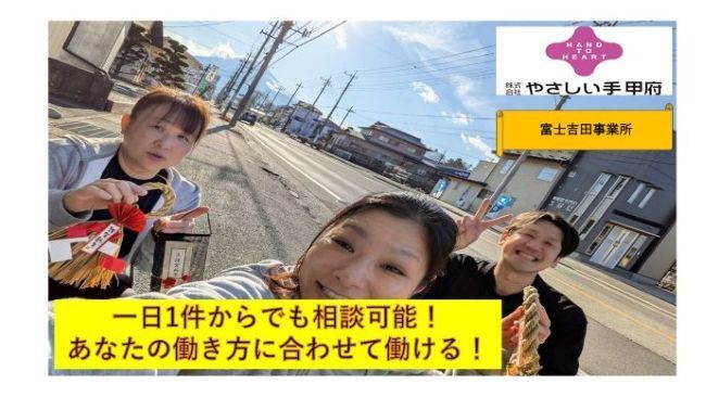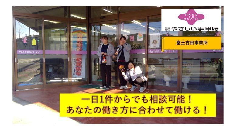 PR 基本時給1,060円~1,160円(資格や経験年数による昇給制)、日曜・祝日1,404円~1,566円(35%UP) 【上記基本時給以外に支給される手当※支給条件あり】 ・業務手当:5,000円 ・子育て支援手当:5,000円 ・評価手当:500円~5,000円 【長く働ける環境】 「育児との両立」「時短勤務」「親の介護」など、それぞれのライフスタイルに応じたベストな働き方ができる福利厚生、職場環境の整備など、みなさんが安心できる職場の環境づくりに力を入れています。 【充実した研修制度】 やさしい手甲府は、『階層別研修』を実施しておりますので、個々の経験に合わせたスキルアップができます。 訪問介護の知識や技術のみでなく、医療知識の研修やリハビリ職との連携など、幅広い知識と経験が習得できます。 こんな方におススメ 介護福祉士を取得したので、サービス提供責任者の仕事をやってみたい 介護施設での経験はあるので、不安はあるけど訪問介護の仕事にチャレンジしたい 登録ヘルパーとして働いていたけど、研修が充実している職場でサービス提供責任者をやってみたい。 育児が落ち着いたので、そろそろフルタイムで復職したいけど・・いきなり正社員は不安。 社員登用制度があります。 やさしい手甲府は登録型ヘルパー⇒パートのサービス提供責任者⇒正社員のサービス提供責任者にステップアップした職員が多数活躍しています ハローワーク同時掲載中 ◆◆お仕事説明会随時開催中◆◆ 履歴書不要 お子様連れでも参加可能です。 詳しくは下のURLをクリック↓↓ https://www.yasashiite-kofu.co.jp/recruit/#t1000769 やさしい手 甲府は、新型コロナウイルスの対応として、感染予防や皆様の健康、働きやすさを大切にしています。 ・出勤時には検温での健康管理や、事業所入り口にはアルコール消毒液での消毒を徹底しています。 ・お子様が学校をお休みになっても、皆さんの働きやすさを大切にしておりますので、働き方について是非ご相談ください