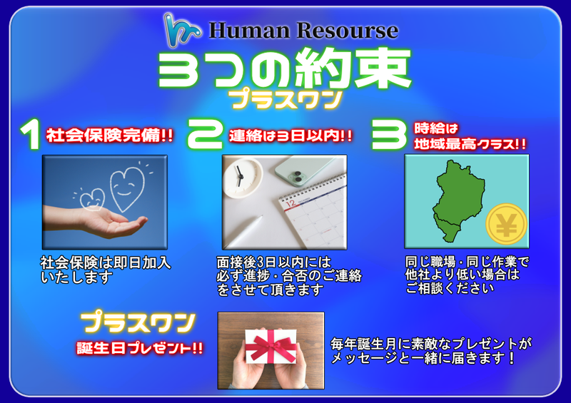 選考プロセス 【STEP1】→応募 ご応募いただいた後、 営業時間内にメールにて面接日のご連絡を差し上げます。 ※電話でのご連絡の場合もあります。 【STEP2】→面接(1回) 堅苦しい雰囲気ではなく、 お互いのことを知るための面談形式です。 緊張せず、普段通りのあなたでお越しください。 ※事務所または面接会場で実施 【STEP3】→職場見学 面接後の選考過程で職場見学を実施しています。 実際の作業環境や仕事内容を確認したうえで、就業を検討することができます。 【STEP4】→入社 3日以内に電話にて合否をご連絡します。 【登録地】 株式会社ヒューマンリソース 所在地:福島県いわき市鹿島町船戸字林下11-9 いわき市内郷コミュニティセンター 所在地:福島県いわき市内郷綴町大木下28-1