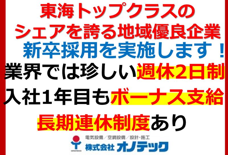 東海トップクラスのシェアを誇る電気工事会社■新卒採用を実施します!■専攻の学部学科は問いません!■入社一年目から嬉しいボーナス支給■週休2日制&長期連休制度あり■年間休日110日以上