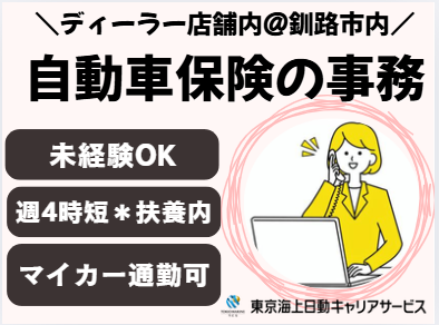仕事の内容 \対人も事務もバランス◎/ ◆TCS先輩スタッフさんご活躍中 ◆扶養内!週4日×実働5時間 ◆火曜と第1・2月曜+土日祝休み @釧路市内!明るくきれいなショールーム内でのご勤務 【基本情報】 雇用形態:派遣社員 雇用期間:長期(3カ月以上) └3月~開始日相談可能 就業時間:9:00~14:00(休憩なし) └9~18時の中で働く時間ご相談下さい☆彡 【必須条件】 ◆パソコン:基本操作(入力~修正) 【お仕事内容】 自動車保険の事務対応を中心に○ ・書類チェック ・入力 ・内容変更 ・保険会社との電話対応 など ◆増員募集! ◆保険はじめての方も応募OK ◆曜日固定・シフト制など…ライフスタイルに合わせて働き方はご相談下さい! 【環境面等】 ・大手自動車ディーラー店舗内でのご勤務です ・30代・40代・50代の多い職場 └子育てに理解ある主婦・主夫活躍中 ・ランチタイムは休憩スペース利用OK └お弁当持参OKです ・制服貸与 └ポロシャツやジャンパー等は貸与、他はオフィスカジュアルで♪更衣室あり 【福利厚生等】 ・扶養内OK ・車通勤OK ・禁煙オフィス!煙苦手な方も安心 ・平日のみOK!土日祝休み ・年間休日120日以上&お休み相談可 └有給休暇 ○●ご応募検討中の方へ●○ ・勤務日数も時間もムリなく調整できるから、家庭やプライベートとの両立も◎扶養内で、無理なくお仕事したい方にぴったりの職場です!ご応募お待ちしています! ○●嬉しいPOINTたくさん!●○ 履歴書不要!開始日相談/長期/主婦・主夫活躍中/未経験OK!保険のキャリアスタート/残業なし!定時で退社OK/時短!5時間以内勤務×扶養内で働けます!週4日以上OK!勤務時間は応相談