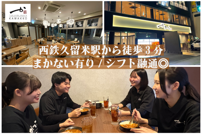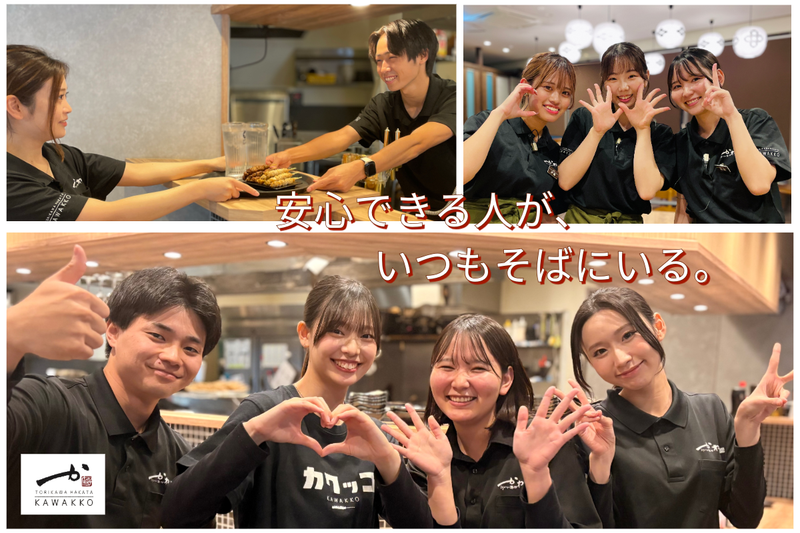 仕事内容 ================= ⭕春の採用スタート!初バイト歓迎⭕ ================= 今回より時給20円アップ!!! 「バイトデビューしたい」 「同世代が多いお店で働きたい」 そんな学生さんにピッタリ✨ 履修が決まってからのシフト調整OK◎ 無理なく学生生活と両立できます♪ かわいい店内の人気居酒屋で ホール・キッチンスタッフ大募集!  ̄ ̄ ̄ ̄ ̄ ̄ ̄ ̄ ̄ ̄ ̄ ̄ ̄ ̄ ̄ ̄ ̄ 【仕事内容】 お客様を笑顔でお迎えし、 “また来たい”と思ってもらえるお店を みんなでつくっていくお仕事です♪ <ホール> ご案内や料理の提供など、 まずは元気なあいさつができればOK◎ 慣れてきたら 常連さんと会話を楽しんだり、 おすすめを紹介できるようになります✨ 接客が初めてでも先輩が横でサポート! <キッチン> 簡単な盛付けやドリンク作りからスタート♪ 包丁をほとんど使わない作業も多いので安心です◎ 「やってみたい!」という方は 焼き鳥の下焼きや焼き場にも挑戦できます❗ ⭐️未経験でも安心の理由 ・レシピ&マニュアル完備 ・できることから少しずつでOK ・同世代スタッフがしっかりフォロー バイトデビューの方も大歓迎です♪  ̄ ̄ ̄ ̄ ̄ ̄ ̄ ̄ ̄ ̄ ̄ ̄ ̄ ̄ ̄ ̄ ̄ ▼✨学生スタッフのバイトのある1日✨▼ ◎午前中は大学で授業 友達とランチや課題をして過ごします♪ ◎帰宅して少しゆっくり 準備をしてかわっこへ出発! ◎17:30 …お店に到着!着替えて出勤準備 ◎18:00 …出勤・朝礼 今日の予約やポジションを確認して営業スタート! ◎18:00〜21:00 …ホールで接客や料理提供 ピークタイムはみんなで声をかけ合いながら連携! あっという間に時間が過ぎます✨ ◎21:00〜 …仕込みや片付け 仲間たちと分担しながら楽しく作業♪ ◎22:00〜 …閉店作業・レジ締め 今日の出来事をみんなで共有! ◎22:30 …まかないタイム みんなで食べる時間も楽しみのひとつ♪ ◎退勤 バスで帰宅 次の日の授業も無理なく行けます◎ 今日もお疲れさまでした✨ ※勤務時間に応じて休憩あり ==================== ▼▼✨かわっこバイトのここが魅力✨▼▼ ⏩学校優先で働ける!  ̄ ̄ ̄ ̄ ̄ ̄ ̄ ̄ ̄ ̄ ̄ 週3日〜OK&短時間勤務も可能◎ 履修やテスト期間に合わせてシフト調整できます! 「学業もバイトも頑張りたい」そんな学生さんを全力で応援♪ ⏩大人気のまかない付き!  ̄ ̄ ̄ ̄ ̄ ̄ ̄ ̄ ̄ ̄ ̄ ̄ ̄ スタッフからも大好評の絶品まかない✨ みんなで食べる時間も楽しみのひとつ! 食費も浮いて一石二鳥♪ ⏩バイトデビューでも安心!  ̄ ̄ ̄ ̄ ̄ ̄ ̄ ̄ ̄ ̄ ̄ ̄ ̄ ̄ まずは座学で“かわっこ”のことを知るところからスタート♪ 現場に出てからも先輩が横についてサポートするので安心◎ 同世代が多く、質問もしやすい環境です! ⏩髪色・ネイルOK!  ̄ ̄ ̄ ̄ ̄ ̄ ̄ ̄ ̄ ̄ ̄ ̄ ̄ ̄ おしゃれも楽しみながら働けます♪ ※清潔感のある範囲でお願いしています✨ =============== ✨1年目アルバイトKさんにインタビュー✨ ◎かわっこで働こうと思った理由は? お客さんとして来たときに、 お店の明るい雰囲気とスタッフさんの楽しそうな姿が印象的で 「ここで働きたい」と思いました。 接客も学べて自分も成長できそうと感じたのがきっかけです。 ⸻ ◎働いて良かったと思うことは? 研修がしっかりしているので、 接客やメニューの知識も一つずつ身につけることができます。 できることが増えて、 お客様に「ありがとう」と言ってもらえたときは すごくやりがいを感じます! 先輩も優しく、 自分の意見を聞いてもらえる環境なのも嬉しいポイントです。 ⸻ ◎これから働こうと思っている方へ 面倒見の良い先輩ばかりで、 初バイトでも安心してスタートできます! 楽しく働きながら成長したい方には 本当におすすめのバイトです