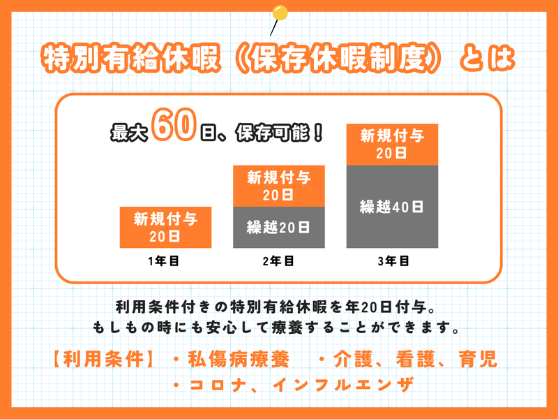 休日休暇 年間休日100日 ※勤務カレンダーあり ※休み:日曜日・祝日・土曜日隔週 【当社独自の休暇制度】 ・保存休暇制度あり(最大60日) ※私傷病療養・介護・看護・育児等限定使用となります。 ※消滅時効にかかる有休の積立ではありません。 法定の有給休暇付与と同時に、20日/年の付与を行い、 付与年数は3年(20日×3年=60日)となります。