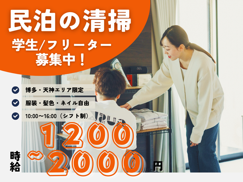 仕事内容 ✨時給は最大2000円!20-30代活躍中✨ ✦・┈┈┈┈┈ ・✦✦・┈┈┈┈┈ ・✦ 最初は時給『1,200円』からのスタート! 仕事に慣れてきたら1部屋単価制になるため 短時間で高収入も実現可能です (時給換算1,500円~2,000円) ①例えば… 小規模タイプのお部屋を6室清掃した場合、 1,500円×6室=日給9,000円(6時間) ②例えば… ファミリータイプのお部屋を3室清掃した場合、 3,000円×3室=日給9,000円(6時間) ✦・┈┈┈┈┈ ・✦✦・┈┈┈┈┈ ・✦ 当社が運営しているホテルや マンションタイプの宿泊施設の清掃作業をお願いします。 【仕事内容】 ・リネン(シーツ類、タオル)の回収 ・床清掃、忘れ物チェック ・ベッドメイキング ・清掃後の撤去作業 など ✦・┈┈┈┈┈ ・✦✦・┈┈┈┈┈ ・✦ \\ Q&Aでお答えします// ▼こんな心配ありませんか?▼ 【Q】どんな働き方ができますか? ✅ Wワーク・扶養内の勤務OK 勤務時間:10:00~16:00 週3~OK✨ 【Q】どんな人が働いてますか?  ̄ ̄V ̄ ̄ ̄ ̄ ̄ ̄ ̄ ̄ ̄ ̄ ✅ 平均年齢29.6歳! 年代、性別問わず活躍できるお仕事です✨ 【Q】仕事中は制服ですか?  ̄ ̄V ̄ ̄ ̄ ̄ ̄ ̄ ̄ ̄ ̄ ̄ ✅ 服装・髪型・髪色・ネイル自由✨ 自分の好きなスタイルで働けます! 【Q】自転車、自動車乗れません…  ̄ ̄V ̄ ̄ ̄ ̄ ̄ ̄ ̄ ̄ ̄ ̄ ✅ 勤務場所は博多・天神エリアのみ! 駅チカの施設が多いため勤務もラクラク✨ 交通費は全額支給です! ✦・┈┈┈┈┈ ・✦✦・┈┈┈┈┈ ・✦ ✅こんな方におすすめ! ➽ハウスクリーニングの経験 ➽マンション清掃やビル内清掃やオフィスビル清掃の経験 ➽ホテル清掃やルーム清掃、商業施設清掃の経験 ➽接客業経験や飲食業経験など コツコツと作業するのが得意な方や、きれい好きな方にピッタリのお仕事です✨