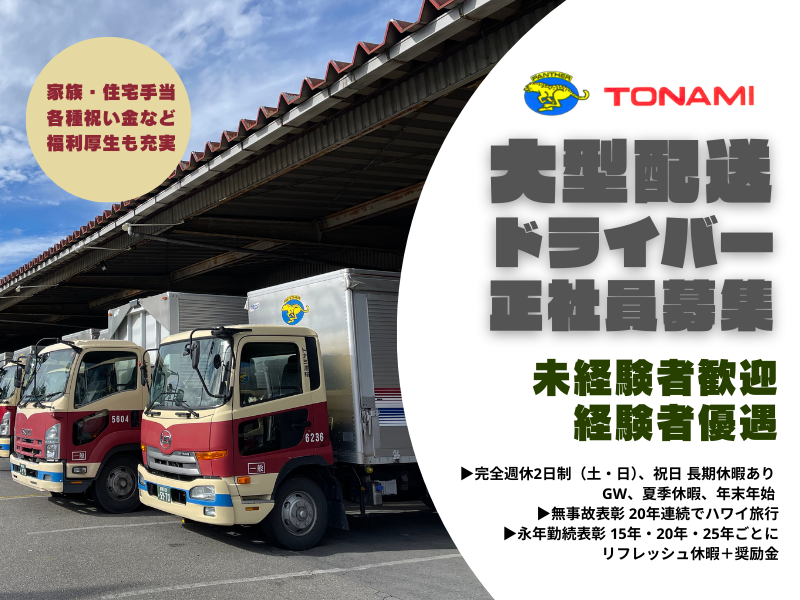 仕事内容 ✦•⊹₊ ⋆ ✦•⊹₊ ⋆ ✦•⊹₊ ⋆ 物流センターや 支店間輸送を お願いいたします。 ✦•⊹₊ ⋆ ✦•⊹₊ ⋆ ✦•⊹₊ ⋆ 【配送先】 関東近郊~関西・北陸などの中・長距離配送です。 (センター・支店間の商品郵送です) 【勤務時間】 日勤×土日祝休みの勤務です プライベートとの両立もしやすい◎ 【配送物】 運ぶ物は文具や化粧品ケース等の 日用品など様々です。 積み下ろしはフォークリフトを使用 して運べるものもあります♪ ⭐トナミ運輸のご紹介 当社は創業は昭和18年、 現在81年目の企業となるトナミ運輸は 全国に143箇所の各種拠点を持つ 物流ネットワークを担う企業の一つです。 グループ売上は年商1400億、 安定した地盤を持っている要因は 小売店から大手メーカーまで 様々な企業間配送のエキスパートとして 続けてきたことです。 ⭐こんな社員も活躍中★ 社員も会社と一緒に成長していく… そんな気持ちから人生のいろいろな場面に 合わせた手当や支援が充実しています! <例えば…Aさんの場合> 【入社】※独身時代 資格支援制度を使用して ✿資格を無料で取得 ▼ 【結婚】 夢のマイホームを購入 ✿結婚手当を取得 ▼ 【子どもの出産・進学】 ✿祝い金を取得 ✿ランドセル・図書カードも取得 ▼ 【親の介護】 ✿介護支援制度を取得 ▼ 【無事故20年】 ✿ハワイ旅行(妻と2名分) など 長く働いてくれる社員にとって 嬉しい制度やありますよ!