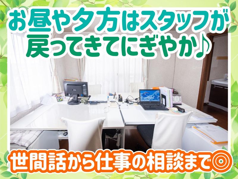 職場環境 現在は9名が在籍中。 ケアマネジャーは3名、ヘルパー6名がおり、 40~50代が活躍中! 会社設立から長く勤務しているスタッフもおり、 これまでの退職理由も前向きなキャリア選択によるものが中心。 日頃から相談しやすく、協力し合える雰囲気が根づいています。