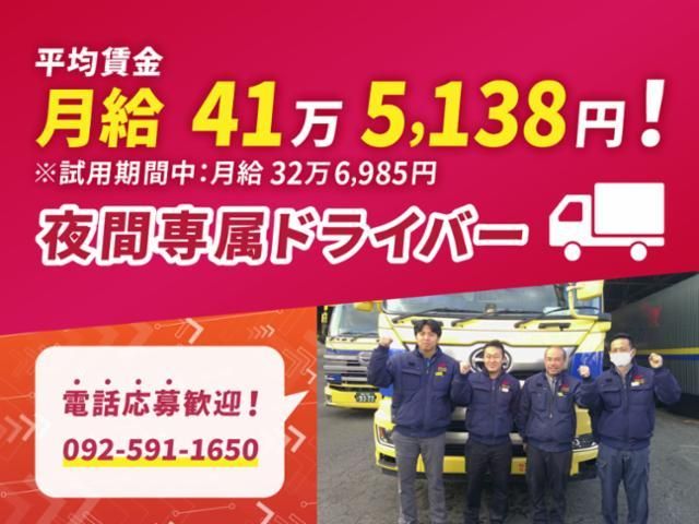 アピールメッセージ 支店間の定期輸送ドライバー募集!電話応募なら当日中に面接設定可!092-591-1650までお気軽に! 【大型免許があれば未経験でもOK】お客様と接する機会は少なめでドライバー業務に専念可/夜勤専属で渋滞も少なめ/仮眠室あり
