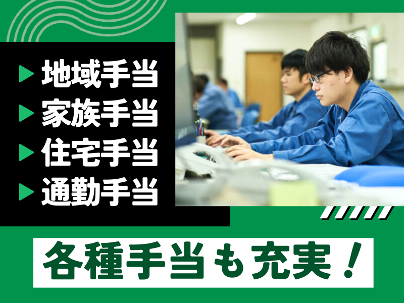 【保険制度】 雇用保険、労災保険、健康保険、厚生年金 待遇・福利厚生 【福利厚生】 ・各種社会保険完備 ・交通費規定支給 (月3万2,000円まで) ・地域手当 ・住宅手当 ・時間外手当 ・家族手当 ・昇給年1回 ・賞与年2回 ・保養施設 ・会社訪問随時受付