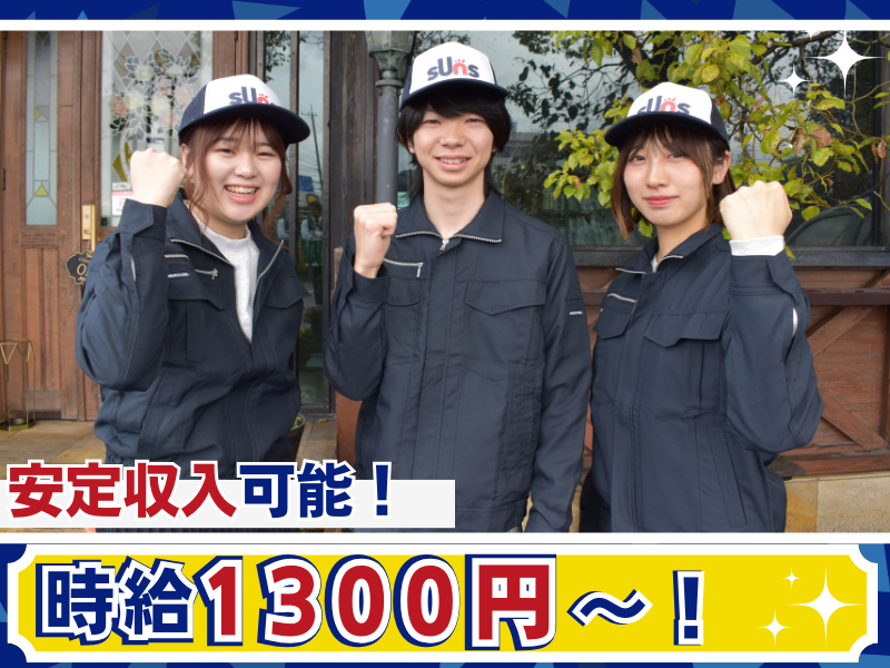 時給1,300円以上 給与詳細 基本給:時給 1300円 〜 ※一律手当4.5万/月 ※交通費規定支給 ※事業所から現場までの 移動費支給あり