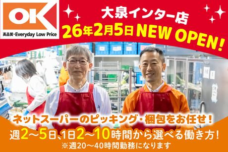 仕事内容 【 お仕事内容 】 ★ネットスーパーの裏方業務! ★接客ナシ/モクモク作業 ★正確さが活かせる仕事です ――――――――――――― こんなことをお任せします! ――――――――――――― オンライン購入された生鮮食品や日用品を、 売り場からピックアップして 梱包するシンプルな業務です。 店内で迷っているお客様を サポートすることもありますが、 接客が苦手でも問題なし! 【 しっかりした研修あり 】 仕事のやり方やルールまわりなど 基礎から実践までじっくり身につけられます! ・経験豊富な社員がしっかりサポート! ・分からないことも、すぐに聞ける環境◎ ⇒勤務初日から1人にさせない安心の職場です♪ 【 始めやすい環境です 】 ―――――――――――――― 2026年2月 NEWオープン! ―――――――――――――― 立ち上げメンバーを募集します♪ 募集人数はなんと170名! 一緒に始めるメンバーも多くて心強い! しっかり学べる研修制度あり◎ ―――――――――― オーケーの魅力♪ ―――――――――― ■仕事終わりにそのまま買い物できる♪ 「時間も手間も節約できて助かる!」 という声が多数届いています! ■安心&安定して働ける職場です しっかりした研修&サポート体制があるから 未経験でも安心スタート! 大手ならではの安定感があるのも魅力のひとつ♪ ■ゆとりある人員配置で安心 1店舗あたり社員さんが18~19名いるので わからないこともすぐに相談できて安心♪ 業界的にも社員数が多い職場だから、 とっても心強いですよ! 【 大泉インター店へのアクセス詳細 】 <バスの場合> 国際興業バス「比丘尼橋」下車、徒歩1分 ・地下鉄成増駅から乗車の場合 「成増駅南口」バス停から14分 ※平日は1時間に5本~6本 休日は1時間に4本~5本 ・石神井公園駅から乗車の場合 「石神井公園駅北口」バス停から15分 ※平日は1時間に4本~6本 休日は1時間に3本~5本 <徒歩の場合> 西武池袋線「大泉学園駅」から徒歩25分! 西武池袋線「大泉学園駅」北口を出て グランエミオさん手前のエスカレーターを降ります。 そのまま東急リバブルさん方面へ直進し、 交差点を右に渡ります。 靴流通センターさんを通り過ぎ、1つ目の路地を左折。 すぐに右折し、道なりに進むとT・ジョイさんが見えてきます。 T・ジョイさんを過ぎ直進し 大通りに出ると左手にお店があります。 ※自転車通勤応相談 【 勤務形態について 】 この求人はパートナー社員の募集です! パートナー社員とは? 週20時間以上働く勤務形態です。 社会保険に加入でき、週40時間のフルタイム勤務など しっかり稼ぐ働き方も可能です。