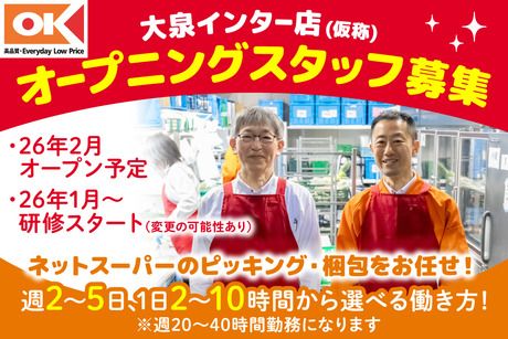 仕事内容 【 お仕事内容 】 ★ネットスーパーの裏方業務! ★接客ナシ/モクモク作業 ★正確さが活かせる仕事です ――――――――――――― こんなことをお任せします! ――――――――――――― オンライン購入された生鮮食品や日用品を、 売り場からピックアップして 梱包するシンプルな業務です。 店内で迷っているお客様を サポートすることもありますが、 接客が苦手でも問題なし! 【 しっかりした研修あり 】 \\2026年1月から研修スタート!// 新店オープンに向けて、 しっかり準備ができる体制が整っています! 研修中も待遇は同じです♪ ※期間は変更の可能性有 ▼▼採用決定後の流れ▼▼ [1]入社説明会 配属部門や勤務時間、シフトなどの雇用条件を お互い確認して、雇用契約を結びます。 [2]集合研修 座学にて、オーケーで大事にしている事や 就業規定(髪色や服装)、挨拶や接客の姿勢など 基本的な事をお伝えします! 最後に部門ごとに顔合わせをして終了◎ [3]店舗研修(1ヶ月前~オープンまで) 近隣の既存店での勤務です。 部門ごとに研修店舗が異なります。 [4]開店!オープニングを迎えます。 仕事のやり方やルールまわりなど 基礎から実践までじっくり身につけて オープンに向かっていくので安心です。 ★オープン後のサポートも充実! ★ノウハウも多く、すぐに聞ける環境! 【 始めやすい環境です 】 ―――――――――――――― 2026年2月 NEWオープン! ―――――――――――――― 立ち上げメンバーを募集します♪ 募集人数はなんと170名! 一緒に始めるメンバーも多くて心強い! しっかり学べる研修制度あり◎ ―――――――――― オーケーの魅力♪ ―――――――――― ■仕事終わりにそのまま買い物できる♪ 「時間も手間も節約できて助かる!」 という声が多数届いています! ■安心&安定して働ける職場です しっかりした研修&サポート体制があるから 未経験でも安心スタート! 大手ならではの安定感があるのも魅力のひとつ♪ ■ゆとりある人員配置で安心 1店舗あたり社員さんが18~19名いるので わからないこともすぐに相談できて安心♪ 業界的にも社員数が多い職場だから、 とっても心強いですよ! 【 大泉インター店へのアクセス詳細 】 <バスの場合> 国際興業バス「比丘尼橋」下車、徒歩1分 ・地下鉄成増駅から乗車の場合 「成増駅南口」バス停から14分 ※平日は1時間に5本~6本 休日は1時間に4本~5本 ・石神井公園駅から乗車の場合 「石神井公園駅北口」バス停から15分 ※平日は1時間に4本~6本 休日は1時間に3本~5本 <徒歩の場合> 西武池袋線「大泉学園駅」から徒歩25分! 西武池袋線「大泉学園駅」北口を出て グランエミオさん手前のエスカレーターを降ります。 そのまま東急リバブルさん方面へ直進し、 交差点を右に渡ります。 靴流通センターさんを通り過ぎ、1つ目の路地を左折。 すぐに右折し、道なりに進むとT・ジョイさんが見えてきます。 T・ジョイさんを過ぎ直進し 大通りに出ると左手にお店があります。 ※自転車通勤応相談 【 勤務形態について 】 この求人はパートナー社員の募集です! パートナー社員とは? 週20時間以上働く勤務形態です。 社会保険に加入でき、週40時間のフルタイム勤務など しっかり稼ぐ働き方も可能です。