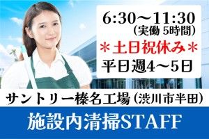 インフォメーション 《午前のみ・平日週4~5日》扶養内調整OK!家計に無理なくプラスできる平日午前パート◇未経験者歓迎 ~ 大手飲料メーカー工場内でのお仕事です ~ 《 サントリー榛名工場 》 お茶やコーヒーなど、人気の清涼飲料水等を製造している工場です 廊下やお手洗いの清掃、事務所や休憩室に設置しているゴミの回収など 施設内を清潔を保ちきれいにするお仕事です 学歴不問・資格不問・経験不問・無資格OK 安定の長期歓迎・社会保険あり 午前のみ+短時間勤務OKのパート・アルバイト 残業なし+平日のみOK! ワークライフバランスばっちり◎ プライベートタイムも充実できます♪ 中高年、ミドルシニア、アクティブシニア活躍中 未経験者歓迎のお仕事です! アピールポイント ◎プライベートと両立しやすい 午前のみ+土に祝休み ◎残業なし ◎未経験者歓迎 ◎ミドルシニア活躍中 未経験の方も丁寧に指導しますので 安心して応募下さい \ ご応募お待ちしております /