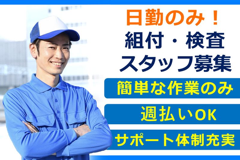 【仕事内容】 \自動車空調部品の製造工場での勤務/ 【具体的には…】 ■軽いプラスチック部品の照合検査 (品番のものを照合する作業) ■組付作業 ■数字入力などカンタンなPC作業 (PCスキルはなくて大丈夫) ============ 作業環境良し! ============ ✅冷暖房完備の部屋の中 ✅親切、丁寧に教えてもらえる ✅お仕事そのものが難しくない ✅少しずつ覚えていけばOK! こういった理由で、 短期で就業開始したスタッフさんが長期に変更。 今も、一生懸命働いてくれています○ ============ 福利厚生良し! ============ ✅なんと、ご飯が無料○ ✅しかも、栄養たっぷりで健康にも配慮 ========================== 実際のスタッフ(30代・元工場夜勤)の声 ========================== ~夜勤のない勤務スタイルを選んで、良かった~ 夜勤をしていた頃、休みの日もからだが重くて、 いくら寝てもスッキリしませんでした。 そんなときに知ったのがこの仕事、 プラスチック部品の検査。 どれも手のひらサイズで、 腰を痛めることはありません。 しかも、将来的に正社員登用を考えてくれる。 安定してじっくり働ける。 安定して働けるから、休日もより充実する。 この勤務スタイルを選んで、本当に良かったです。 ========== 当社スタッフ ========== 約45名が在籍しています。 人と話すのが苦手な人 優しい人と働きたい人 マイペースで働きたい人 いろんなスタッフがいます。 あなたのご応募、お待ちしています。 【求人ID-ART】