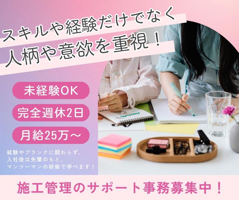 仕事内容 戸建て・オフィスビル・商業施設etc. 様々な建物を解体し、更地に戻す 『解体工事』をメインに 事業を展開している当社。 後には新築一戸建てが建ったり、 沢山の人々が訪れる商業施設が できたり…いわば“未来の街づくり” のスタート地点! 今回はそんな社会貢献性の高い事業を 現場とオフィスの両方から支えて頂く サポート事務を大募集! ずっと社内にこもりっきりではなく、 施工現場のパトロールなども行う アクティブなサポート事務です◎ ・‥…━…‥・‥… 【どんな仕事?】 ◆オフィス内 ┗各種書類・役所への提出物の作成 ┗工事写真帳の作成 ┗電話・メール・来客対応 ┗総務業務のお手伝い ◆オフィス外 ┗工事現場近隣地域の調査・まとめ ┗現場の安全パトロール・近隣への挨拶回り ※Word・Excelの基本操作が 出来れば問題ありません! ※入社後は工事事務専門の先輩のもと マンツーマンの研修で業務を学べます! ・‥…━…‥・‥… 【未経験の方もOK!】 工事関連事業の事務と聞くと 例えばCADを使用したり、 設計図を読み解いたり…など 難しいイメージがありませんか? 当社の場合は提出書類は形式的な 内容ですし、Excel操作も数字や文章を 入力する程度のものだけ。 事務職経験者さんであれば即戦力! 未経験の方であっても研修を経て すぐに一人前になれます♪ ・‥…━…‥・‥… 【採用では人柄や意欲を重視!】 スキルや経験よりも大事なのは とにかく人柄と意欲です! 仲間やお客さまを思いやりつつ、 時間を守って的確に業務できる 方であれば大歓迎♪ たとえ経験がなかったとしても、 これから業務として様々なことを 学んでいきたいという前向きな 姿勢があれば、しっかり評価・ サポートいたします! ・‥…━…‥・‥… 【キャリアアップを応援!】 手に職を付けたい方や成長意欲を お持ちの方を当社はしっかり後押し! お仕事に慣れてきた後は、 宅地建物取引士や1級施工管理技士、 CAD関連の資格などの 取得を目指すことも可能です◎ 一部、取得支援制度や祝い金制度も 完備していますので、いち事務職で 終わらないワンランク上の キャリアを描けます! ・‥…━…‥・‥… 【個々の成果をしっかり評価】 事務職=安定給与のイメージが強いですが 当社では職種に関係なく、貢献度に応じて しっかり昇給・昇格を実施しています。 完全未経験でも成長次第で 年収400万円~600万円以上を 目指すことが可能です! 会社の利益は社員全員へ還元するのが 当社のモットー。刺激ややりがいを 肌で感じたい方はぜひご応募ください♪ ・‥…━…‥・‥… 【職場の雰囲気について】 当社では現在男性2:女性8 ほどの割合で女性社員が多め! 教育担当となる先輩も女性社員です。 性別問わず社員同士の コミュニケーションも活発で、 なんでも気軽に相談できる 柔らかい雰囲気があります。 社内イベントも ●毎年の社員旅行(費用は全部会社持ち!) ●豪華中華料理・有名蕎麦屋での食事会 ●会員制クラブ体験 ●映画・歌舞伎・狂言鑑賞会 ●日帰りBBQ 他 などたくさん! 様々な思い出に残る体験が出来ますよ♪ ・‥…━…‥・‥… 【オフも思いっきり楽しむ!】 土・日・祝休み+各種休暇制度 (アニバーサリー他)で年休は 125日以上! 有給も取得しやすく、 旅行や趣味のイベントなど 皆さん柔軟に取得しています! オフを満喫しながら、オンでも 最高のポテンシャルを発揮できる! そんなメリハリある環境です。 ・‥…━…‥・‥… 【社員インタビュー】 入社10年目/女性社員A(工事事務) あらゆる工事は施工管理や 施工スタッフだけの力では 動きません。 市役所への届け出や地域の調査、 各種提出書類が揃って初めて 工事がスタート出来るんです。 だからこそ私たち施工管理は 常に事務の方と連携しながら 仕事を進めています。 普段のPC作業の中では 気付きづらいかもしれませんが たとえば大きなビルや 綺麗な新築戸建てが建ったり、 大規模な地域開発が行われたり… その背景には事務の方の 細やかな仕事が活きています。 そんな大きなやりがいを ぜひ当社で味わって いただければ幸いです!
