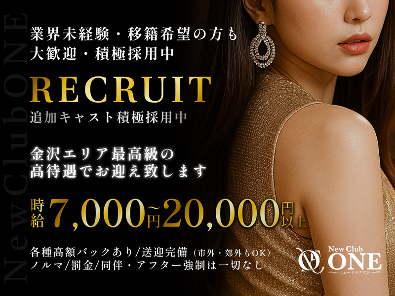 仕事内容 【この求人のポイント】 ✅2025年4月OPEN!ほぼオープニングメンバー募集! ✅入社祝い金あり!(※規定あり) ✅体験入店もOK!(※全額日払い) ✅託児所・送迎・寮完備!働きやすさ抜群! ✅手ぶらで出勤OK!身分証のみで体験入店可能 ✅スタッフ全員が同期スタートで派閥・上下関係ゼロ ✅ノルマなしで毎日楽しく働ける♪ ✅終電上がり&WワークもOK 【弊社について】 「New Club ONE」は、2025年4月1日に金沢市・片町に新規オープンしたクラブです。 安定した環境と、スタッフ一人ひとりが輝ける柔軟な職場づくりを大切にしています。 【募集背景】 新規OPENに伴い、フロアレディのメンバーを積極採用中♪ ほぼオープニングメンバーとして、みんな同じスタートラインで安心して働けます。 【仕事内容】 フロアレディとして、お客様の接客を中心にお願い致します♪ 未経験でも安心の教育体制あり!まずは体験入店からスタートできます! 【具体的なお仕事内容】 ・お客様のご案内、オーダー対応 ・ドリンク作り ・ニコッと笑顔で楽しく接客・会話 【先輩の前職一覧】 アパレル販売員/飲食店スタッフ/営業職/美容師/カフェ店員/事務職/介護スタッフ/ホテルスタッフ/イベントスタッフ/学生アルバイト