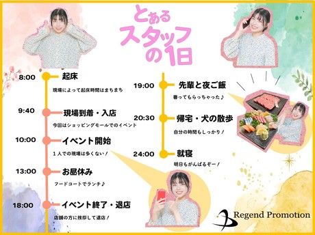 シフト制 勤務時間 実働時間:7時間/日 平均勤務日数:1ヶ月あたりnull日 《就活でこんな風に役立ちます!》 1~2回生の方は就活のこととかイメージわきませんよね?? 大変そう。ざっくりそんなイメージなのかなと思います! レジェンドプロモーションの就活に役立つポイントを具体的に紹介しちゃいます! (1)大学生さんがとにかくたくさん在籍! 1~4回生まで幅広く、何百人と在籍しているので 先輩からのアドバイスや同期との情報交換などが盛んに行われてます! もちろんフリーターさんも多数! (2)物怖じしないコミュニケーション能力が自然と身につく! ティッシュをお配りするのもスマホの説明をしたりと初対面の方と コミュニケーションをとることに慣れてもらえると思います。 さらに、伝わりやすい話し方や適した会話スピードなどは 気が付いたら身についちゃってます! 10:00~18:00 または 11:00~19:00 ★実働7時間・休憩60分 ※勤務地により勤務時間の変動あり ★週1日~OK