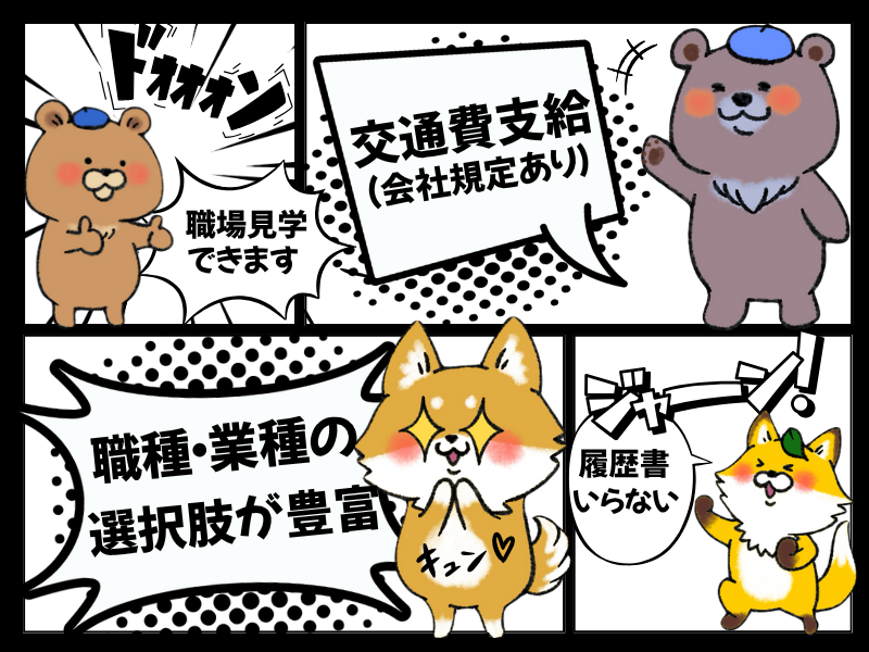 職場環境 ■職場見学も可能なので安心 ■WEB面談受け付けております ■翌日振り込みの仮払い制度あり (弊社規定、稼働分のみ) 喫煙所:喫煙所あり(屋外)