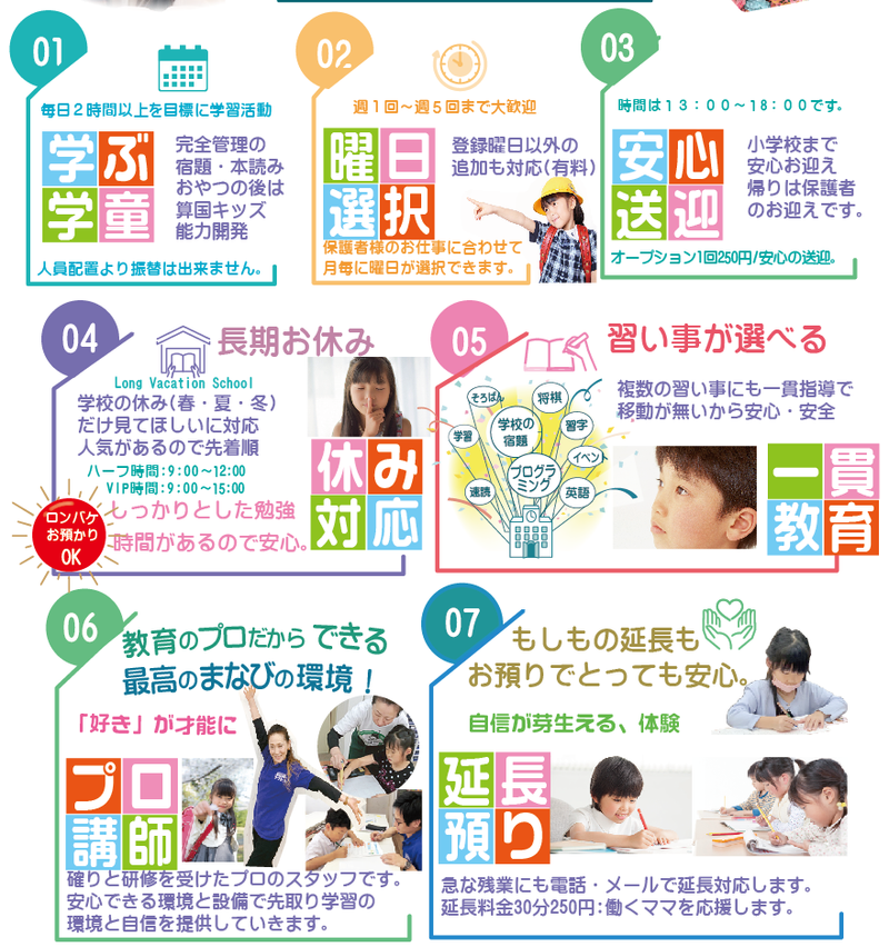 求める人材: 求める人材 【必須条件】 ✅子ども達と接することが好きな方! ✅子ども達の未来をつくりたい、関わりたいという意欲のある方! 【歓迎条件】 ※どれか1つでも当てはまれば、ご応募ください ✅子育て経験のある主婦(主夫)の方 ✅土日祭日休みで長期的に働ける方 ✅民間学童保育、小学生の宿題など学習サポート経験者 ✅近距離の送迎が出来る方、徒歩でのお迎えもあります。 ✅カルチャの習い事に興味がありキャリアアップしたい方。 ✅メリハリある温かいコミュニケーションがある方 ✅有資格(保育士・教論)歓迎・無資格者もOK ✅実子の体調不良時は、お休みサポート体制 ✅将来希望の方は社員へのキャリアアップあります! ✅安全衛生のお掃除・片付け・簡単な事務仕事が出来る方 【こんな人にぴったり】 * 子どもが好きな方 * 子育て経験を活かして働きたい方 * 子どもに有意義な体験を提供したいと思っている方 * 身体を動かすことが好きな方 * 健康的に働きたい方 * 保育園からキャリアアップしたい保育士さん * 保育の経験をしてみたい方 * 子どもの成長を一緒に喜べる方 * 褒めて伸ばす関わりができる方 * 安全運転ができ、送迎が可能な方歓迎 * 明るくコミュニケーションが取れる方 * 教育・保育に興味がある方(未経験OK) · ・子どもが本気で好きな方 · ・明るく前向きに取り組める方 · ・チームワークを大切にできる方 · ・運動が好き方(色々なタイプの先生がいるので苦手な方も大歓迎) · ・保育/教育経験のある方(未経験も歓迎) · 学生さん、主婦(夫)、フリーターの方、ダブルワークもOK。 · 週2日から、一日4時間から大歓迎! 運動好き、英会話上手になりたい、工作好き、描くのが好き、歌が好きなど色々なタイプのスタッフが活躍中!