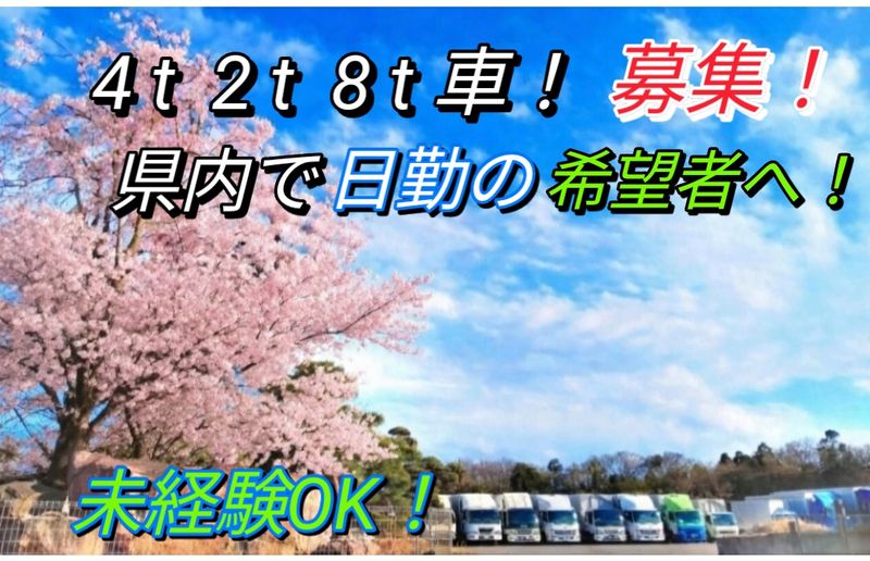 仕事内容: ― - - ― - - ― - - ✧ ※ 募集内容 ※ ― - - ― - - ― - - ✧ 業績好調・新規拡大の 大幅増車により ! 千葉 県内 の 近距離 正社員 募集 ! ! 免許取得の支援を強化中 ! 大型 , 中型 , 普通免許から応援 ! カレンダーどおりの 日勤の 勤務 ! 高速 渋滞のない 県内の近距離 ! 年末年始 と 夏盆の 1週間連休 ✕ 年 2回 ! ― - - ― - - ― - - ✧ ※ 勤務地 は ※ ※ 四街道市・佐倉市・八街市 の いずれか 近い方からの 出勤になります。 ・四街道. 佐 倉 営業所 ・八 街 第一 営業所 ・八 街 第二 営業所 からの近い方 ― - - ― - - ― - - ✧ 4 t . 8 t . 2 t . 大型 15 t. 全て 両開きのウイング車 ! 事故率 が少ない 近距離の 昼勤務! 体に負担 (冷凍) のない 通常のトラック ! 未経験も 歓迎 ! ( 普通免許でOK ! ) - - ― - - ― - - ― - - ✧ ※ 完全 昼勤務 ! 、夜間 . シフトは一切なし ! ※ 土・日・祝 休み ! ( 土曜は希望で毎週 連休可能 ! ) ※ 2025年~ 法制度に 近距離の 日勤で 安心 ! ※ 日勤の 県内 ゆえに 少ない事故率 ! ※ 毎日が自宅から出勤して 必ず自宅に帰れます ! ※ ※ ※ ※ ※ ※ ※ ※ ※ ※ 未経験の方、歓迎です ! 県内の昼勤務なので事故率が少なく、まったくの 初めての未経験でも安心して始めやすい仕事です ! 普通免許でO Kです ! いま活躍しているメンバーのなかでは、応募の時に 未経験だったり免許がなかった方が何名もいます! 思い切って始めると思ってたよりすっとできます! はじめての物流ドライバーへの転職に不安を感じて いる方には、安心のいつでも見学が自由です。 - ― - - ― - - ― - - ( 製造・営業・事務・建築・販売・工事・工場・ 土木・建設・整備・飲食・警備・介護士・バス・ ダンプ・タクシー等からの色んな違った仕事から きた方も 活躍中です ! ) 初めからていねいに 新人の 指導と 応援フォロー サポートしてゆきますので、安心・大丈夫です ! ※ 免許の 応援サポートしています ! 普通免許しかない20代も、中型以上の免許取得を 応援サポートしています ! 今 免許資格がなくても、あきらめずに一度ご連絡 ください ! 当社で免許をとった方は 何名もいます ! 20代. 30代 の 若い力が半数以上、活躍中です ! ( 40代 ~ 各年代の ベテラン方も 活躍しています ) ■ 自由な見学や 同乗の体験が可能 ! はじめてのトラックドライバーの仕事や、あらたな 転職に不安を感じている方にも、安心できる見学や 同乗の体験が希望によりいつでも自由にできます! また体験的な 短期期間の入社もできます ! ( 見学だけでもOKです!) ※ 女性ドライバーも活躍中です! ※ ※ ※ ※ ※ ※ ※ ※ 〇 電話と面接は 土日祝、夜間 も 可 ! (8時~21時 ) ⇩ 問い合せは・・080-3551-8984 : 直通へどうぞ ! ― - - ― - - ― - - ― - - ✧ - ― - - ― - - ✧ ※ 勤務地 は ※ ※ 四街道市・佐倉市・八街市 の いずれか 近い方からの 出勤になります。 ・四街道. 佐 倉 営業所 ・八 街 第一 営業所 ・八 街 第二 営業所 からの近い方 ※ 四街道 I C・佐倉 I C・酒々井 I C の 各 I C から、すべて 1 0 分 以内 ! ※ 仕事場所へはどの営業所からも近くです ! 写真 2 枚目は 大桜の咲く 八街第一営業所 から ( 八街ろ185 - 81・186 - 66・185 -67 ) 他・・ ※ ※ ※ ※ ※ ※ ※ ※ 【 安心の 歴史 と信頼 ! 】 会社への定着率も良く、勤続 10 ~ 20 年以上の メンバーも多数います ! 20代 ~ 30代 の若い メンバーが半数以上 ! ( 40代 ~ 各年代も 活躍中 ! ) - - ― - - ― - - ― - - ― - - 豊富な業種にめぐまれた 大手各社の優良企業様が 当社のお取り引先なために、不況にも大変つよく 仕事量はいつも豊富で 安定しています。 お取り引きの企業様の業種は単一ではなく、また 同業社の間の2次3次の多重請け構造の仕事では ないので、貨物の量はつねに安定していて、これ からさらに大幅な増加が見込まれています。 安心してずっと 永年 勤めていける会社です ! - - ― - - ― - - ✧ 【 企業理念 】は 企業 は 人! 人材 は 宝 なり ! すべてはお客様の為に・・ 社員は宝 であり、みな 家族です ! - - ― - - ― - - ✧ 【 輸 送 エ リ ア 】 ※ 千葉県内の近距離のみ、固定エリア輸送です。 佐倉市、八街市、四街道市、千葉市、成田市、 山武市、匝瑳市、東金市、冨里市、八千代市 など 日曜・祝日・夜間の シフト勤務はありません ! ( 中長距離等の 県外とはことなるので、日曜. 祝日. 年末年始の シフト勤務や夜間の配送、車のなかで 寝泊りすることはありません ) 成田航空貨物の長時間の拘束待機は一切ありません 中長距離便は すべて外部に委託されているために、 県内の近距離に特化しています! 入社後にあとから 中距離や 夜勤・シフト勤務への 変更(配置がえ)など一切なく安心できます。 ※ 近距離 の 日勤 ゆえに ! 毎日が自宅から出勤して 必ず自宅に帰れます ! 大事な家族から 遠く離れて 留守にする日がなく、 まいにち お風呂に入れて 大事な 家族と一緒に、 食事ができます ! - ― - - ― - - ― - - ✧ 【 使 用 車 種 】 ※ 4t・8t・2t・大型 15 t、全てウイング車 ! 荷物の積み降しは左右のウイングを開けて横から すべ