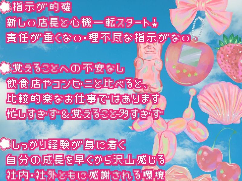 【保険制度】 雇用保険、労災保険、健康保険、厚生年金 待遇・福利厚生 【福利厚生】 交通費支給 商品の購入不要 制服貸与 ネイルOK 髪型自由、髪色自由 ピアスOK 各種社会保険完備 研修あり インセンティブあり 正社員登用可 健診あり 紹介制度 自家用車通勤OK 駐車場完備(無料) ⭐オリジナルポイント制度あり⭐ シフト1時間=5円が貯まる! 2000円から商品券に交換できます