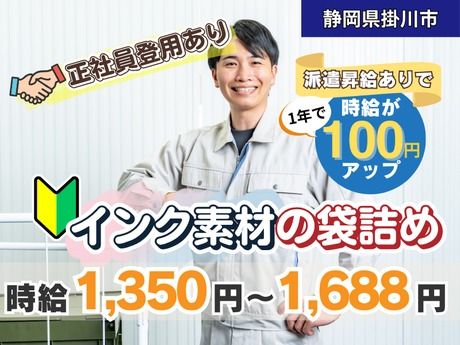 仕事内容 【仕事内容】 <<アピールポイント>> ・1年毎に時給100円UPの昇給制度あり! ・正社員登用可能性あり ・未経験歓迎 ・日払い(前借り)可能!※規定有 ≪ 電話でのお問い合わせ ≫ 053-489-6001までお問い合わせください。 有機赤色顔料の専門メーカーで様々な色を作るベースの製造工場です。 インクの顔料(素材)を袋に詰める作業をお願いします。 重量は10kgほどになります。 インクと聞くと臭いが気になるかと思いますが、水性インクを主に扱う工場の為、臭いはキツクありません。 未経験でも問題なく、将来的に正社員登用の可能性もあります。 ※フォークリフト資格・経験者歓迎(所有していなくても問題ありません) 【月収例】205,000円+交通費規定支給 (時給1,350円、1日7.25時間 、残業なしの場合) *未経験OK *正社員登用可能性あり *社会保険即日加入OK *フルタイム勤務 *評価、昇給制度あり *退職金制度あり