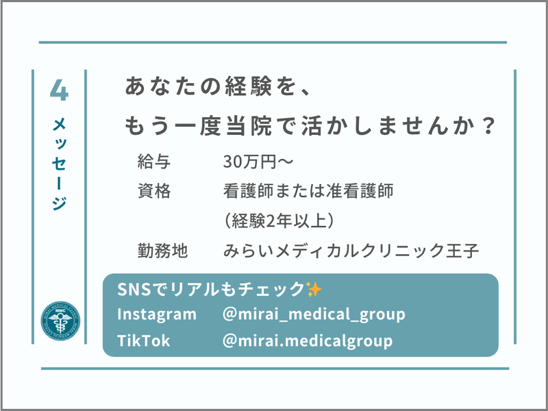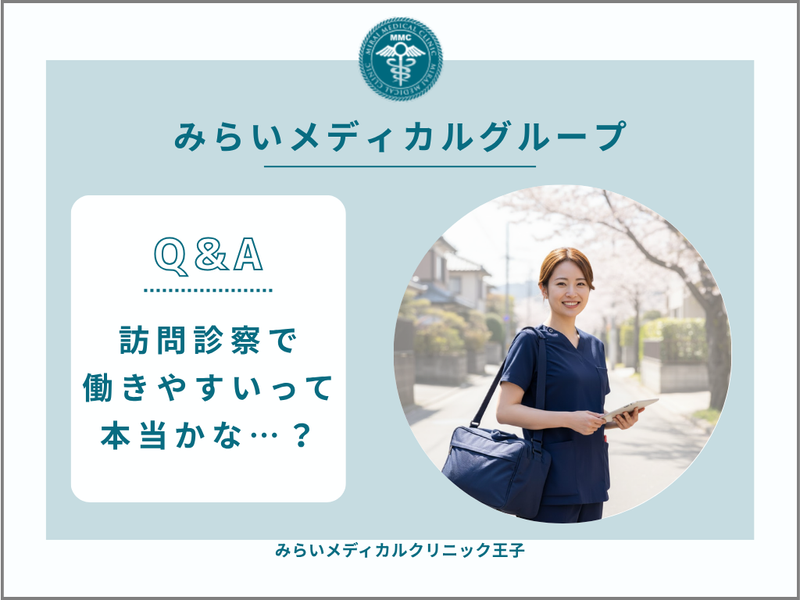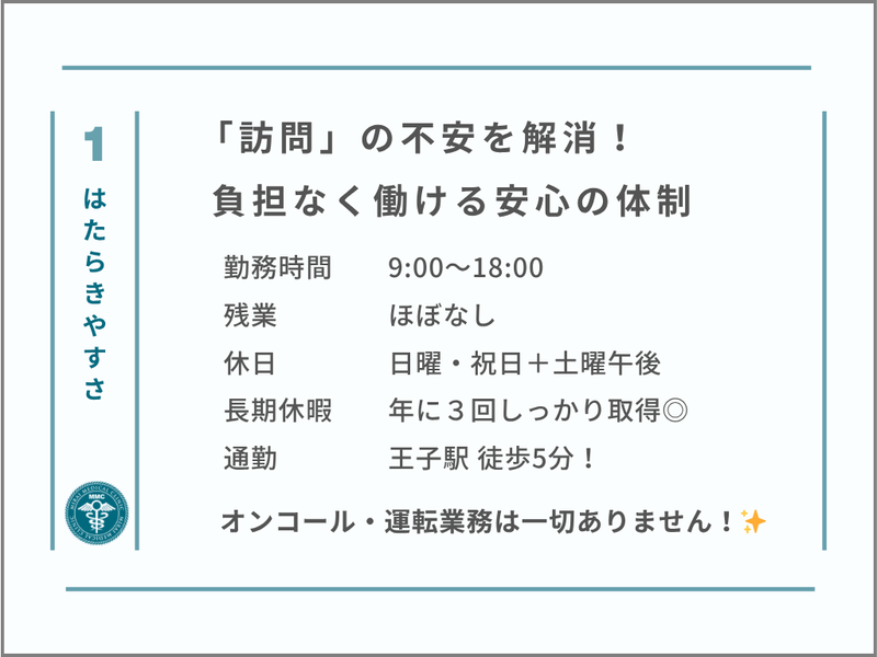 仕事内容 ⭐ オンコール対応なし ⭐ 運転業務なし(免許不要) ⭐ 日曜・祝日休み+土曜午後もお休み ⭐ 夜勤なし・日勤のみ ⭐ 土曜出勤時は振替休日あり ⭐ 残業ほぼなし✨ ⭐ ブランク・未経験も安心の研修&フォロー体制 ⭐ チームワーク抜群!わからないことはすぐ相談 ⭐ 地域医療に貢献できるやりがいのある仕事 *‥‥*‥‥*‥‥*‥‥*‥‥*‥‥* \訪問診療に専念したい、看護師さんへ/ 「外来の慌ただしさより、患者様とじっくり向き合いたい」 「訪問の仕事はしたいけど、オンコール対応が不安…」 「車の運転に自信がなくて、在宅医療を諦めていた」 そんな想い、ありませんか? みらいメディカルクリニック王子は、 「訪問診療・訪問リハビリ」に特化した、 地域密着のクリニックです。 この求人、他のクリニックと少し違います。 ✨ オンコール対応、ありません。 ✨ 運転業務、ありません。(免許不要です) ✨ 日曜・祝日+土曜午後は、お休みです。 訪問診療の現場でよくある 「運転のプレッシャー」や「休日の呼び出し」とは無縁の環境。 日勤のみ(9:00~18:00)で、 残業も月平均10時間程度と少なめ。 「在宅医療に挑戦したいけど、負担が大きいのは…」 そんなあなたにこそ、知ってほしい職場です。 当院には、病院の忙しさから離れたい方や、 家庭と両立しながら看護を続けたい方が多数在籍。 今回は、そんな看護師経験者が 「ここなら安心」と 選びたくなる理由をご紹介します♪ ■経験者だとわかる! “訪問診療”で、この働きやすさ ┈┈┈┈┈┈┈┈┈┈┈┈┈┈┈┈•• ⭐ オンコールなし & 日勤のみ 「夜勤で生活リズムが崩れる…」 「休みの日も電話が鳴るか不安…」 そんな病院や訪問看護特有の悩みとは無縁! 勤務時間は【9:00~18:00】のみ。 夜間や休日の対応は一切ないので、 心身ともに負担なく、 プライベートの時間をしっかり確保できます。 ⭐ 日曜・祝日休み+土曜午後休み 「家族や自分の時間は絶対に大事にしたい」 そんな想いに応える休日体制です。 土曜日は交代制ですが、 出勤した場合は振替休日を取得可能◎ 残業もほぼなしなので、 家庭や趣味も、しっかり両立できます✨ ⭐ 【重要】運転業務がありません 「訪問診療=運転必須」だと思っていませんか? 当院では、医師やリハスタッフが運転するため、 看護師さんがハンドルを握ることはありません。 運転免許がなくてもOK! (もちろん、お持ちの方も歓迎です) 「都内の運転は怖い」「ペーパードライバーだから…」 そんな理由で在宅医療を諦めていた方に最適です。 ⭐ ブランク・訪問未経験でも安心 育児や介護で現場を離れていた方も大丈夫! 先輩スタッフがマンツーマンで丁寧にサポート。 外来・訪問・リハの仕事にも、 一歩ずつ慣れていけます。 ⭐ チームでサポート!あたたかい職場 スタッフ同士の連携が抜群で、 わからないことや困ったこともすぐに相談できます。 子どもの行事でお休みが欲しい時や、 お子さんの急な体調不良でのお休みも、 「行ってらっしゃい!」 と送り出してくれる環境で子育て世代も安心♪ ⭐ 患者さまに寄り添えるやりがい 病院の外来では難しい、 患者さまの「生活」にまで寄り添えるのが訪問診療の魅力。 医師やリハスタッフとチームを組み、 「ありがとう」の言葉を直に感じられる、 とってもやりがいのあるお仕事です✨ ■実際の仕事内容 ┈┈┈┈┈┈┈┈┈┈┈┈┈┈┈┈•• 【訪問診療のみ(外来業務なし)】 医師に同行し、 在宅で療養されている患者さまのご自宅や施設へ伺います。 (看護師さんの運転業務は一切ありません) ✅ 訪問診療のサポート業務全般 ・バイタルチェック ・採血、点滴、注射、医療処置の補助 ・医療器具の準備、管理 ・電子カルテの記入 ・患者さま、ご家族からの相談対応 ・関係各所(ケアマネジャー等)との連絡調整 など ⭐ 教育体制 ────── 「訪問は初めてで自信がない…」 そんな方でも大丈夫!✨ 入社後は、先輩看護師や医師との同行訪問からスタート。 仕事の流れや手順、患者さま情報を ゆっくり覚えていけます。 あなたが安心して「独り立ちできる」と感じるまで、 チーム全体で手厚くサポートします◎ ■院長・スタッフからのメッセージ ┈┈┈┈┈┈┈┈┈┈┈┈┈┈┈┈•• 「在宅医療には興味があるけど、 オンコールや運転業務がネックだった…」 「外来の慌ただしさから離れて、 患者様とじっくり向き合いたかった」 そんなあなたの不安や想いを解消できる環境が、ここにはあります。 スタッフ同士のチームワークも良く、 分からないことはすぐに聞けるので、 ブランクがある方や訪問未経験の方も安心です。 私達と一緒に「みらいメディカルクリニック王子」で 地域医療に貢献しませんか?