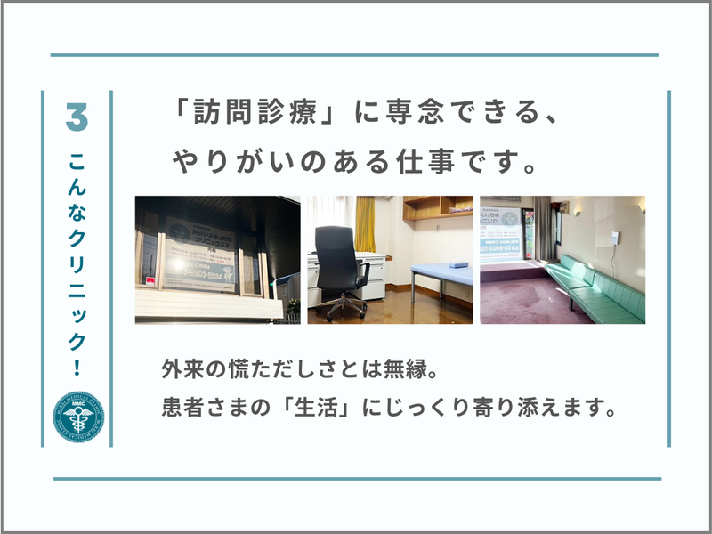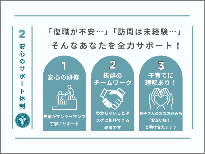 職場環境 \ブランク復帰も安心!/ ✅ チームで支え合うあたたかい職場 …ベテランも新人も関係なく、みんなが助け合う雰囲気♪ ✅ 訪問診療に専念できる✨ ✅ 長く続けられる働きやすさ …日勤のみ・残業ほぼなし・日祝休+土曜午後休が基本 喫煙所:なし(敷地内全て禁煙)