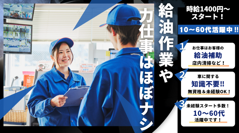 仕事内容 \未経験大歓迎×フルタイム勤務で安定収入/ セルフガソスタで【接客少な目&力仕事ナシ】◎ ✨土日祝インセンティブ支給&着替え時間も手当支給✨ ✨♦°˖⭐°˖✨♦°˖⭐°˖✧✨♦°˖⭐°˖✧ 【ここがポイント!】 ◆時給1400円~+インセンティブあり ◆週5日×実働8hで月収23万円以上可能! ◆土日祝の勤務には嬉しい加給あり ⇒1時間につき100円のインセンティブ支給! ◆さらに… ⇒着替え時間にも手当支給あり◎ ◆資格取得支援あり/乙4類取得で+時給29円UP! ✨♦°˖⭐°˖✨♦°˖⭐°˖✧✨♦°˖⭐°˖✧ ー【お仕事内容】ー ◆セルフ式のガソリンスタンドでの接客サポート業務 *給油補助(一部給油作業あり) *店内清掃・整備 *お客様対応(少なめ) →力仕事はほぼナシ! 未経験でも安心して始められる内容です◎ 車に関する知識も必要ナシ! ー【働き方】ー ⏰シフト例: ・8:00~17:00 ・10:00~19:00 ・13:00~22:00 ・9:00~13:00 ・13:00~17:00 など 「安定収入が欲しい」 「フリーターから正社員を目指したい」 そんな方にぴったりの環境です! ー【未経験スタートを全力応援!】ー 初めてでも安心して始められる理由があります! 「ガソリンスタンドって、難しそう…」 「資格がないとできないのかな…」 そんな心配、ここでは一切いりません! ◆セルフ式スタンドだから… ・お客様が自分で給油する仕組み! ・スタッフは”サポート役”がメイン ・力仕事・専門知識も不要です◎ ◆未経験スタートの先輩が多数! 今活躍中のスタッフも、ほとんどが未経験からのスタート。 最初は先輩がマンツーマンで丁寧に教えるので、 「ガソスタデビュー」も安心です♪ ◆無資格OK!もちろん資格取得もサポート! 「乙4類危険物取扱者」など、 働きながら資格を取得して時給UPも可能。 取得支援制度もあるので、 将来のためにスキルを身に付けたい方にもおすすめです!