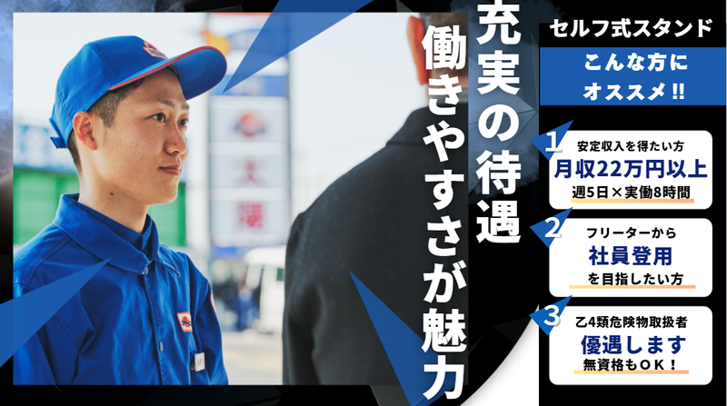 求めている人材 \未経験・無資格OK!学歴不問&ブランク歓迎/ ガソリンスタンドや車に関する 知識がなくても大丈夫! 実際に「やってみたい」で始めた 未経験の先輩も多数活躍中! 人柄・やる気を重視した採用なので、 まずはお気軽にご応募下さい♪ ✅【こんな方にオススメ】 ・フルタイムで安定収入を得たい方 ・シフトにたくさん入りたい方 ・接客よりコツコツ作業が好きな方 ・ルーティンワークが得意な方 ・フリーターから社員登用を目指したい方 ✅【活かせる経験・スキル】 ・セルフガソリンスタンドの勤務経験 ・車検・整備士工場などでの実務経験 ・メカニック、自動車整備士、自動車検査員などの資格・スキル ・カーディーラーでの接客や軽整備経験 ✅【優遇資格】 ◇乙種第4類危険物取扱者(時給+29円支給) ※資格がなくてもご応募OK!資格取得支援制度あり◎ ✅【活躍中のスタッフ】 10代~60代まで男女問わず幅広く活躍中! 主婦・主夫、ブランク明けの方も多数在籍しています。 フリーターさん歓迎!