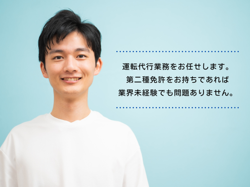仕事内容 業績好調につき、増員募集です。 <まずはこんな方に> ・二種免許はあるけど、運転代行は初めて ・本業+αで、夜だけ効率よく稼ぎたい ・タクシー・送迎経験を活かしたい ・いきなり決めるのは不安なので 話を聞いてから考えたい 全部OKです◎ ――――――――――――――――――― 【お仕事内容】 運転代行業務をお任せします。 第二種免許をお持ちであれば 業界未経験でも問題ありません。 ▼1日の流れ 1. 運転代行の依頼が入る 2. 二人一組で随伴車に乗ってお客様の所へ 3. 合流後、 ・あなた:お客様の車を運転 ・相方:随伴車を運転 4. 2台で目的地まで安全に移動 ※常に2人1組なので、未経験でも安心! ――――――――――――――――――― 【この仕事の安心ポイント】 ✅ 二種免許があれば、代行経験は不問 ✅ 夜間のみ・週2日~OK ✅ フル勤務じゃなくても、しっかり収入 ✅ タクシー経験者の再スタートにも◎ 「フルタイムはもう大変…」 そんな方が、無理なく続けている職場です。 ――――――――――――――――――― 【応募について】 「まずは話を聞いて、 仕事内容や条件を確認してから決めたい」 そんな応募も大歓迎です。 不安な点は、面接でしっかり確認できます。 電話番号:054-340-6251 ―――――――――――――――――――