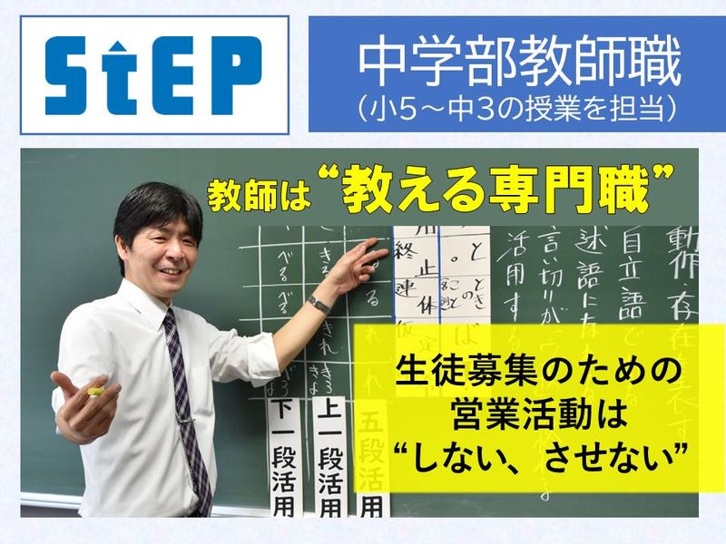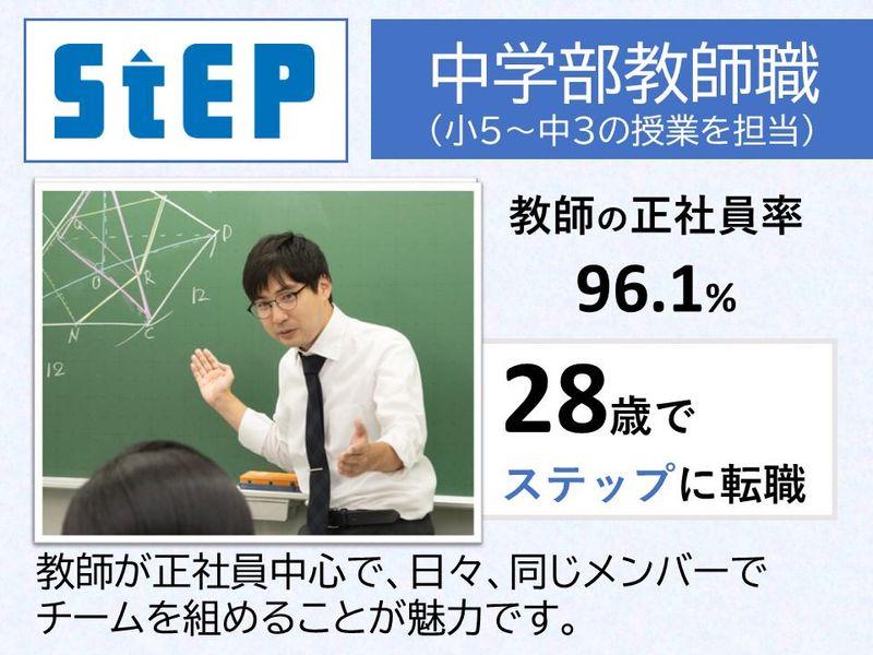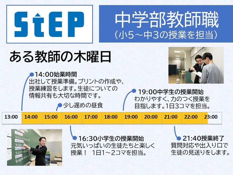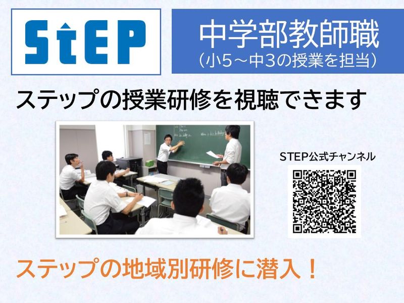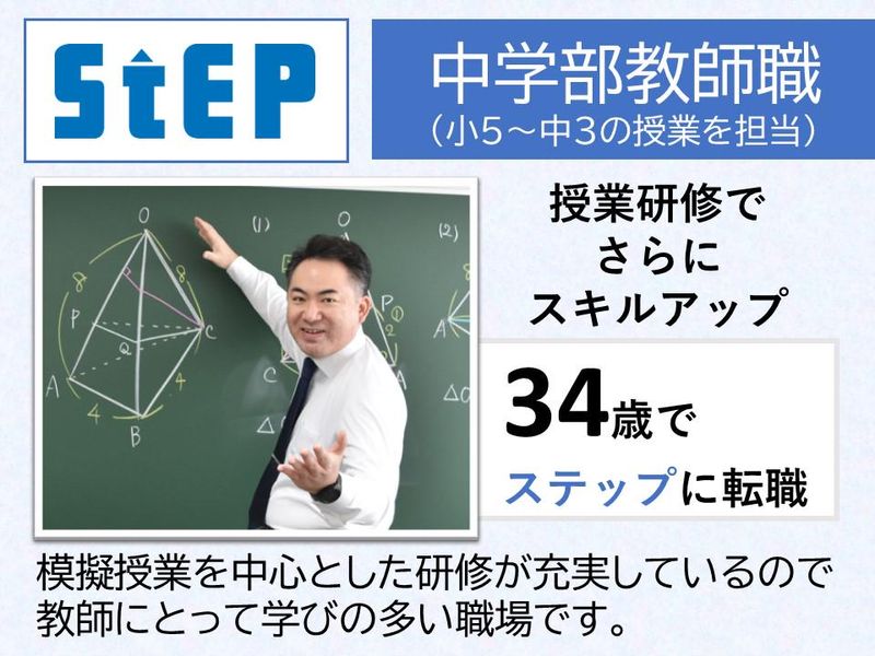 仕事内容 ■担当授業について■ 小5生~中3生を対象にした学習指導、高校受験指導です。 1日4~5コマの授業を担当します。 1クラスは中学生20人、小学生16人の集団授業です。 ■担当教科について■ 文系の方(英語+社会または国語+社会) 理系の方(数学+理科) ※英数国の中から1科目に専念するエキスパート教師の採用も行っています。 ■勤務地について■ 神奈川県内145スクールのいずれかに勤務していただきます。 横浜市に49校、川崎市・藤沢市に15校、相模原市11校をはじめ、神奈川県全域にスクールを展開しています。 ==横浜市内のスクール== 二俣川、瀬谷、鶴ヶ峰、弥生台、戸塚、三ツ境、立場、杉田、港南台、鴨居、十日市場、中川、センター南、北山田、こどもの国、ふれあいの丘、本郷台、センター北、白楽、仲町台、菊名、戸塚東、東戸塚名瀬、藤が丘、大倉山東、江田、たまプラーザ、市ヶ尾、綱島、上大岡、中山、あざみ野、長津田、保土ケ谷、和田町、上永谷、鶴見、井土ヶ谷、日吉本町、東戸塚平戸、Hi-STEP横浜、Hi-STEP戸塚、Hi-STEP二俣川、Hi-STEP青葉台、Hi-STEP金沢文庫、Hi-STEP日吉、Hi-STEPセンター南、Hi-STEPたまプラーザ、Hi-STEP上大岡 ■ステップの特徴■ <授業に集中した方には最適な環境> ・営業・勧誘活動はしない、させない ・質の高い授業を行うことに集中できる ・教師自身の勉強や授業準備の時間をしっかり確保 ・教師職の96.1%が正社員講師(2025年4月現在) ・年間で約30回を超える授業研修 ■ステップでの働き方■ <安心して長く働くことができる> ・東証プライム上場。安定した経営基盤 ・4年連続で給与のベースアップを実施 ・平均年齢38.6歳 ・神奈川県内に展開 (都道府県をまたぐ異動はなし) ・週休2日(日・月が基本) ・年2回、1週間以上の長期休暇あり 2025年度の例 GW休暇:4月下旬から9連休 秋休暇:9月または10月に9連休 ・独身寮完備(神奈川県内18棟201室) ■ステップの授業■ <生徒参加型のコミュニケーションを大切にした授業> ステップの教師は、「生徒と水平な目線」が基本スタンス。 教室の主役はあくまでも生徒。 生徒と教師がコミュニケーションをとりながら進める 対話型の授業を大切にしています。 ■ステップの戦略■ <生徒募集の営業活動は“しない、させない”> 電話勧誘や友人紹介、ポスティングなどの営業活動は行いません。 授業の質を高め結果として口コミや評判で 生徒が増えていくことがステップのスタンス。 室長、ブロック長になっても現場(授業)の中核的存在として 教えることにエネルギーを投入します。 <教師は教える専門職> 新人研修は年間およそ15回、 地域別研修は年間およそ10回。 それに加え、夏期・冬期講習前の 集中研修があります。 教師一人ひとりが模擬授業を行い 課題を指摘したり、技術を共有したりと 常に向上を目指しています。 自社作成のテキスト以外も プリントや理科実験の教材など 各教師がオリジナルの教材を作り上げています。 - 【応募者の皆さんからいただくご質問】 Q:決まった授業パターン(型)などはありますか。 A:「この単元はこの文章を使ってこう教えなければならない」というような細かい縛り、ないしは細部にわたる「ステップ方式」のようなものはありません。教師も日々成長していますから、「今年はこの単元をこういう風に教えてみたい」という思いが自分の中から沸き上がってきたりします。工夫を重ねながら挑戦していくことに、教える仕事のおもしろさがあると思います。ただし、ステップで大切にしていることは「交流感のある双方向の授業」です。「上から目線」ではなく生徒の目線の高さに合わせたコミュニケーションを大事にしていくこと。これは共通のスキルにしていきたいと考えています。 Q:補習やテスト対策を行ったりすることはありますか。 A:補習は「この生徒は授業についてこられていないな」と思ったとき、「病気や家庭の事情で授業を何回かお休みした」ときなど、積極的に行っています。例えば、授業の前に少し早く呼んで教える、授業後に少し残して教える、授業のない週休日(月曜日)にスクールに来て教える等です。なお、休講日の月曜の補習は登録し許可を得たメンバーしか行うことができません。またテスト対策で忙しい時期も日曜・月曜の連続勤務は禁止しています。いずれもよいコンディションを保ち、授業をしていくための措置です。 Q:どのようにして授業は評価されるのでしょうか。 A:授業の評価をするのは、まずは自分自身です。授業が終わった後、「今日はいい授業ができた」とか「会心の授業だった」とか思えると心が弾みます。また生徒が授業に参加して「時間があっと言う間に過ぎた」や「授業が楽しみ」と言ってくれると嬉しい気持ちになります。生徒や一緒に働く校舎のメンバーから信頼されるのが一番の評価だと考えます。システム的には年2回の生徒アンケートや認定テスト、撮影した授業映像の監査等が行われます。教師としての実力、貢献度を評価します。 Q:2