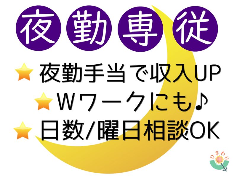 仕事の内容 アットホームな《介護付有料老人ホーム》で 夜専介護スタッフさんの募集です!! *定員43名 家庭的な雰囲気のもと、共同生活を通じて 認知症をお持ちの方々が自分らしく過ごせるよう支援を行っています** 1人1人に向き合ったケアができる施設です! 夜勤専従のお仕事なので、空いてる時間を有効活用できますよ♪ 【この求人のポイント!】 ・30代・40代・50代活躍中! ・水、土、日のみ ・週1~2日OK ・曜日・日数などご相談ください♪ ・ブランクOK! ・マイカー通勤可能 ・駅チカ!池田駅から徒歩7分♪ ・Wワークにおすすめ 【ひまわりのサポート体制】 ・お忙しい方やお電話が苦手な方はメールでの相談OK ・曜日や勤務時間はご希望に合わせてご相談可能! ・専任のコーディネーターが就業後のアフターフォローまで徹底サポート! ・面談・初日も同行するので安心◎ 【業務内容】夜勤介護業務:食事介助・排泄介助・環境整備・記録