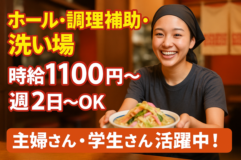仕事内容 未経験から始められる♪人気飲食店スタッフ募集! \人気の麺類を提供しているお店で一緒に働きませんか?/ 【お仕事内容】 ◎レジでのお会計 ◎お客様のご案内や配膳などのホール業務 ◎盛り付けなどの簡単な調理補助 ◎食器洗い・片付け など 難しい作業はありません! 最初は「いらっしゃいませ」と元気に挨拶できればOK♪ 一つずつ丁寧にお教えするので、未経験の方も安心です。 【ここがポイント!】 ✅ 未経験歓迎!初バイト・ブランクありでも大丈夫 ✅ 笑顔で接客できればスグに慣れます ✅ 明るく活気のある雰囲気で楽しく働ける ✅ まかないありでお腹も大満足♪ 「接客が初めてで不安…」という方も、先輩スタッフがしっかりサポートします! 学生さん・フリーターさん・主婦(夫)さんまで幅広く活躍中。