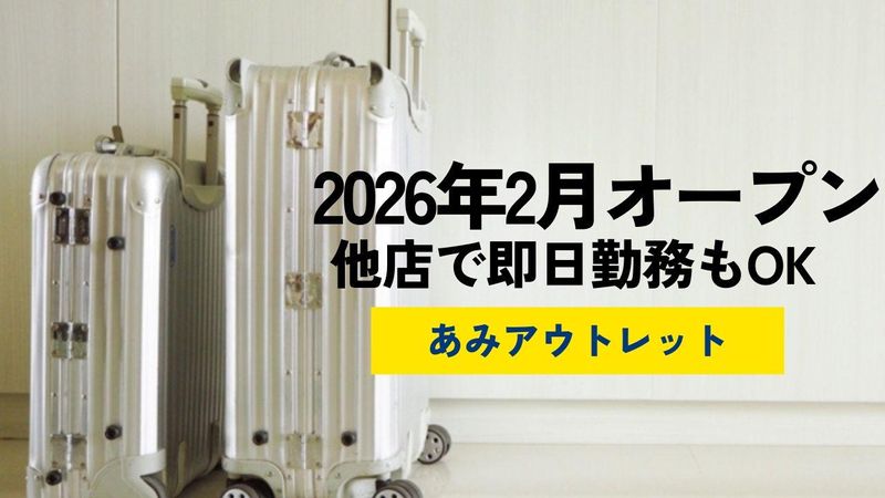 仕事内容 ✨2026年2月あみアウトレットオープン✨ スーツケース・バック販売。 履歴書不要!スマホで簡単WEB面談! ※2月OPENの為1月中旬よりスタート予定 ✅【ポイント】 ・年始はお休み♪ ・みんな同期、人気のオープニングスタッフ ・希望があれば即日勤務もOK ・未経験歓迎 ・正社員登用あり ・週2~Wワーク、扶養内勤務可 【お仕事内容】 ・接客販売/レジ ・商品陳列/ディスプレイ変更 ・検品/品出し ・スーツケース ・在庫管理 ・バックヤード整理 アルミ製のカッコイイスーツケースの販売。 その他バッグや雑貨小物も! (^^)機能性抜群の為オススメしやすいです♪ マニュアルや店長の優しいフォローがあるので安心の環境です♪ 販売によくある個人ノルマはない為、スタッフ一丸となり目標を目指すシステム◎ 販売未経験の方も働きやすく、チームワークも抜群です◎ ≪スタート日について≫ *オープン迄は週2~、 2月からフルタイム切替え *即日からフルタイム(系列店で研修) など、希望ご相談ください。