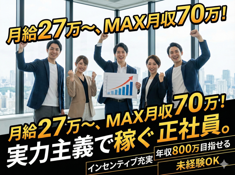 仕事内容 ✨月給27万円スタートの高待遇 ✨インフルエンサーマーケに携わる ✨成果が収入に直結する環境 \流行を仕掛けて稼ぎたい方へ/ 店舗様や企業様に対して 集客支援やPRのご提案を行う やりがいのあるお仕事です。 【具体的な業務内容】 ✅PRサービスの電話提案 ✅アポイントの獲得 ✅契約後のフォローアップ 【入社後の流れ】 まずは商材知識や 電話での話し方を学びます。 今話題のインフルエンサーマーケなど 売りやすい商材が中心です。 実力次第でどんどん昇給・昇格! 入社1年でリーダー抜擢も可能です。 ■採用担当者からのメッセージ 稼げる環境をご用意しています 「年収を上げたい」 「自分の力で稼いでみたい」 そんなハングリー精神を歓迎します。 MAX月収70万円の実績あり! 未経験からでも高収入プレイヤーへ 私たちが育成します。 【✨入社者インタビュー】 ①元フリーター/入社1年目/23歳 「同世代より稼ぎたい」一心で応募しました。最初は不安でしたが、マニュアルと先輩のサポートがあり初月から手応えを実感。半年で月収50万円を超え、自信がつきました。頑張りが数字として給与に直結するのが最高に楽しいです! ②元販売職/入社2年目・リーダー/27歳 前職は年功序列で昇進が遅く転職。ここは完全実力主義で、入社8ヶ月でリーダーへ昇格しました。現在は部下の育成にも携わり、年収は前職の倍に。「誰がやるか」より「何をやったか」を正当に評価してくれる環境です! ③元営業職/入社3年目/31歳 将来の起業に向け、圧倒的なセールス力と経営視点を養うために選んだ会社です。単なる電話業務ではなく、マーケティングやPL管理まで任されるため視座が高まりました。合理的に働き、実力を試したい方には最適な環境です。