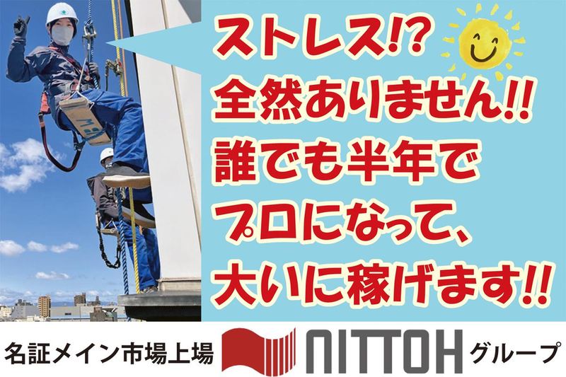 仕事内容 ……………………………………………… ✨ここがPoint!<仕事編> ……………………………………………… ✅時代と社会に求められて 大いに稼げるプロの仕事です! ✅本当に全くの未経験でOK! 興味があれば育てます。 ✅一生モノの国家資格も 会社負担で取得しましょう! ✅3~4人のチームワークの仕事です。 いい仲間たちと、のひのび! ストレスなんて全然ありません。 ……………………………………………… ✨ここがPoint!<会社編> ……………………………………………… ✅名証上場企業グループの 安定成長企業です! ✅今年で創業51年! ビルの窓ガラスクリーニングでは 全国トップクラスの技術集団! ✅名古屋エリアでは、 ・東山スカイタワー ・グローバルゲートタワー ・ミッドランドスクエア ・大名古屋ビルヂング ・ウインクあいち ・アルペン丸の内タワー ・CBC放送 ・テレビ愛知 などを手がけています! ✅転勤ありません! ……………………………………………… ✨ここがPoint!<働き方編> ……………………………………………… ✅あなたらしく自由に働く! 「今月は思いきり稼ぐ!」 「有給フルに使って長期連休♪」 ……どちらもOKです! ✅有給休暇の取得率98.2%! ✅月8日~11日休み・シフト制 好きな日を指定できます♪ ✅実働7時間15分、残業ほぼなし! てか、ほとんどの現場は定時より 早く終わって撤収します♪ ……………………………………………… ✨具体的な仕事内容は? ……………………………………………… ◎高層ビルをはじめ、さまざまなビルや 施設のガラスクリーニング事業を 手がける、この分野では全国トップ クラス企業です。 ◎ここ名古屋営業所は、 愛知・岐阜・三重のビルや施設の窓を ロープやゴンドラを使って クリーニングします。 もちろん、建物の内部から作業して 窓の内側もキレイにします。 【高い所、苦手ですか?】 ◎当社の社員にも、苦手な人はおり、 ビル内側からのクリーニングを 専門にしています。 ◎時には大企業の社長室にも入ったり。 高い所は苦手……という方も、 ぜひご相談ください! ……………………………………………… ✨まずは成長することが仕事! ……………………………………………… ◎もちろん、いきなり高層ビルの外側の クリーニングはできません。 ◎ゴンドラに乗るのも「ゴンドラ取扱 業務特別教育」を受ける必要が ありますし、ビルクリーニング技能士 などの国家資格も、多数あります。 ◎だから、まずは成長することが 皆さんの仕事です。 ◎私たちビルワークは、この分野の リーディングカンパニーとして、 とくにKYT(危険予知トレーニング)を はじめとする教育研修はもちろん、 身だしなみやマナー教育にも 力を入れています。 ◎導入研修の流れとしては、 ・作業のルールを学ぶ ▽ ・地上での見張り・千倍のサポート ▽ ・ビル内部の窓ガラスクリーニング ▽ ・高所作業の研修 ▽ ・外側からの作業にチャレンジ! となります。 【安全第一です!】 ◎もちろんKYTは、日々の作業前に必ず 実施し、各現場の作業手順とともに 全員に周知を徹底します。 ◎またベテランの先輩が、チェック リストに基づいて、安全パトロールを 実施。各現場に合った、より安全な 作業手順の指導や、若手の技術向上の ための指導を行います。 ◎全くの未経験という方も、 入社半年もすれば「プロ」として 活躍し、稼げますよ!