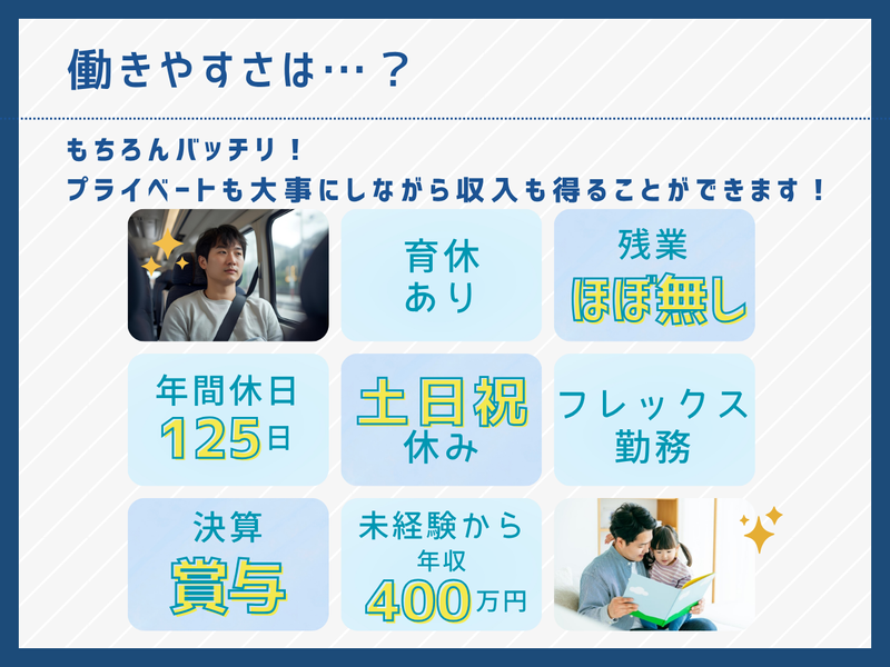 休日休暇 <完全週休2日制> ◆土日・祝日お休み └休日出勤の際は 代休・振休の取得可能 ⭐年間休日125日 <その他※長期休暇あり> ■年末年始(2024年は9連休) ■有給 ■産休制度あり ■育休制度あり ■介護休暇 ■忌引休暇 ※有給の取りやすい環境です^^ ※男性の育休実績もあり!