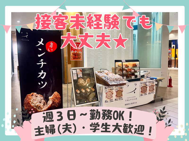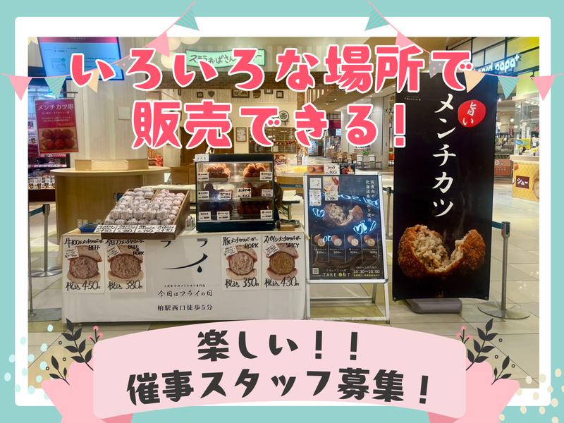仕事内容 ◆◆事業拡大に伴う 新規スタッフの増員を決定!◆◆ ✨お惣菜の店舗販売スタッフ✨ ⭐インスタで話題♪ 柏駅徒歩2分の人気店で働こう! ⭐未経験・学生・主婦(夫)みんな歓迎! TV・SNSでも注目!地元で人気の “メンチカツ・コロッケ”などの お惣菜店でスタッフを大募集♬ 事業拡大で“平日催事”もスタート予定! 今までは土日祝限定でしたが、 平日催事も行うことが決定! お客様との会話を楽しみながら、 人気商品をPRできます♬ 販売未経験でも 「人と話すのが好き」 「明るく声かけできる」方なら大歓迎! 常連さんも多く、楽しく働ける環境です! ┈┈┈┈┈┈┈┈┈┈┈┈┈┈┈┈┈┈┈┈ ✅お仕事内容 ┈┈┈┈┈┈┈┈┈┈┈┈┈┈┈┈┈┈┈┈ 柏駅近くの人気お惣菜店 「今日はフライの日」にて、 店頭や各催事会場 (アリオ柏・ららぽーと柏の葉・モラージュ柏など)で お惣菜の販売・簡単な調理補助をお願いします。 どんどん販売エリアを拡大していく可能性あり☆ どれもマニュアル&サポートあり♪ はじめてでも安心スタート! ▼主なお仕事 ・お惣菜の陳列・販売・レジ ・簡単な盛り付けやフライ作業 (包丁を使わない調理補助) ・催事販売での商品陳列・販売 (柏店舗出勤→現地販売→帰りは店舗まで送迎あり) ⏩未経験・主婦(夫)さん・学生さん大歓迎! ⏩簡単なお仕事なので資格などはなくて 大丈夫ですよ! ⏩家事の経験なども活かせるお仕事です!! ⏩イベント出店は 「いつもと違う場所で楽しく働きたい方」 にも人気です♪ ┈┈┈┈┈┈┈┈┈┈┈┈┈┈┈┈┈┈┈┈ ✅ここが魅力! ┈┈┈┈┈┈┈┈┈┈┈┈┈┈┈┈┈┈┈┈ ⭐インスタフォロワー2500人超の話題店♪ ⭐久しぶりの募集!定着率が高く、 安心して働ける職場です ⭐主婦・学生・Wワーカーなど 幅広いスタッフが活躍中 ⭐あなたの生活スタイルに合わせた シフトで働けます! ┈┈┈┈┈┈┈┈┈┈┈┈┈┈┈┈┈┈┈┈ ✅こんな方にぴったり! ┈┈┈┈┈┈┈┈┈┈┈┈┈┈┈┈┈┈┈┈ ・人と話すことが好きな方 ・声を出して明るくお客様と関わりたい方 ・家事の合間に働きたい主婦(夫)さん ・放課後や授業のスキマに働きたい学生さん ・Wワークで収入を増やしたい方 ・接客・販売のお仕事に興味がある方 ⏩1人で不安な方はご友人との応募もOK! 未経験から始めたスタッフも多数活躍中♪ ✨フライが好きなあなた。 「食べるのが好き」から「働いてみたい」へ 話題のお店で、楽しく働いてみませんか? ご近所さんやお友達との応募もOKです! ご質問などもお気軽にお問い合わせ下さい! たくさんの方のご応募お待ちしております! ー 採用特設サイト新オープン ぜひご覧ください♪♪ https://hc-hldgs.com/ ー