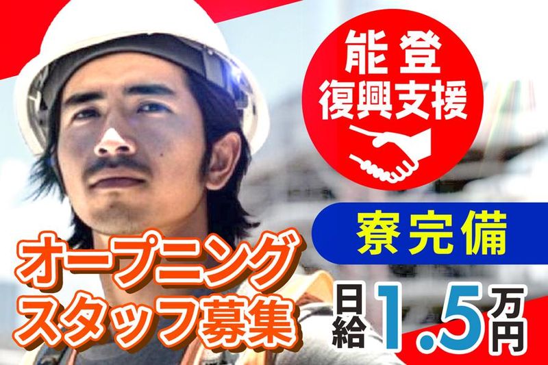 仕事内容 \オープニングスタッフ募集!/ ▶40〜50代が主役の現場。最後の転職を、安心と安定のある場所で。 【新しい環境への一歩をサポート!】 当社では安心して一歩踏み出せるよう、入社祝い金10万円(規定あり)を支給! まっさらな環境だからこそ、上下関係やしがらみもなく、全員が同じスタートラインです。 「新しい職場で心機一転頑張りたい」ーそんな想いを後押しする環境を整えて、あなたのご応募をお待ちしています。 ・住み込み可能!【完全個室】1人部屋の寮完備! ※写真/間取りはイメージです。 ・資格がなくてもOK! ・被災地の役に立てる仕事 \あなたの力で地域に希望を!/ 能登半島復興の現場で、地域の未来を共に築くお仕事です! 現地では解体作業が進んできています。次に求められているのは「土木の力」。 舗装・清掃・整地など、復興の“仕上げ”を支える重要な段階に入ります。 解体がひと段落したら、今度は“土木”で力を貸してください! 【オススメポイント】 ■未経験からでも始められる作業多数! ■資格や経験不要・すぐにスタートOK ■【完全個室】住み込み1人部屋の寮完備&長期安定の現場です ※写真/間取りはイメージです。 「次の現場、まだ決まっていない…」そんな方もぜひご相談ください! ■お仕事内容 能登半島の復興支援に携わるお仕事です。 解体作業が落ち着きつつある今、次に必要とされているのは「土木作業」。 具体的には、 ・土工事 ・解体工事 ・重機補助や資材運搬 など 「解体の仕事が終わってしまって…」という方も、そのまま土木作業へスムーズに移行できます。 ※解体のお仕事も残りますので、解体のお仕事をご希望の方もご応募ください。 未経験の方でも、最初は先輩がついてイチから丁寧にお教えします。 住み込みOK・1人部屋の寮完備なので、遠方からの応募も安心です。 =================== 最後の転職は“安心”で選ぶ。 =================== 「まだまだ稼ぎたい」「最後の転職にしたい」ー そんな方にこそ選ばれている現場です。 当社では、長期安定の契約を前提としており、毎月の収入をしっかり確保しながら腰を据えて働くことができます。 さらに、完全個室の1人部屋寮を完備。 仕事終わりは誰にも気を遣わずしっかり休息。 「家族のために稼ぎたい」「生活費を抑えて貯金を増やしたい」など、単身赴任の方にとっても大きな安心につながっています。 ================= 誰かのために稼ぐあなたへ。 単身赴任の味方になる現場です。 ================= 現場で活躍しているメンバーの中心は40〜50代。 「経験」「落ち着き」「段取り力」…これまで培ってきたものすべてが武器として評価されます。 「収入・安定・暮らし」そのすべてを手に入れられる環境で、第二のキャリアを最後のキャリアに変えませんか?