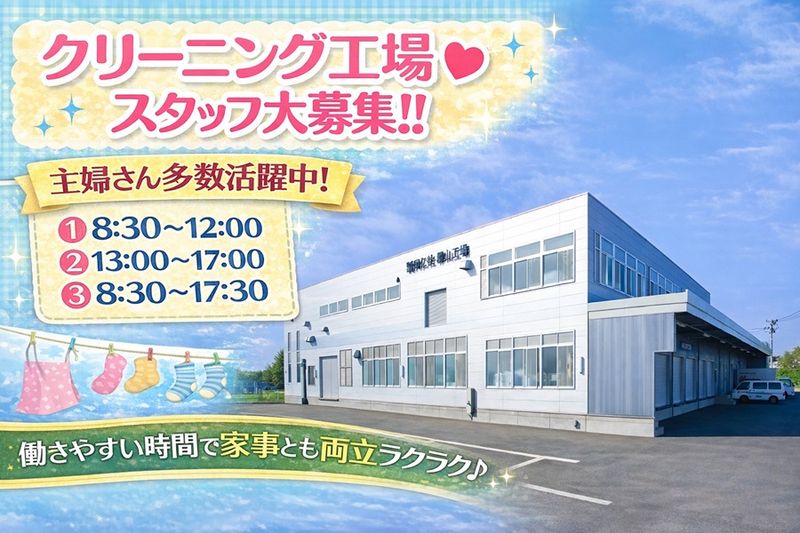 アピールポイント: ◆安心の職場環境◆ 工場では40人以上が働いており、そのほとんどが未経験者です。 経験のない方でもイチからお教えしますのでご安心ください♪ また、工場スタッフの多くは 子育てと両立しながら働いている方が多く在籍中。 子供の体調が悪かったり、学校からの急な呼び出しなどにも 柔軟に対応していますので家族最優先で働けます♪ 子育てと仕事の両立をしながらでも 十分に力を発揮できる環境を整えています! 工場の生産ラインでの作業スタッフは30代~50代まで幅広い年齢層の方が活躍中です★ ◆ここがポイント◆ ◎クリーニング工場内でのお仕事! ◎土日休みの安定勤務♪ ◎子育てに理解のある職場! ◎マイカー通勤OK!広い駐車場完備! 当社は、主婦(夫)の方も積極的に採用しています。 「子どもが急に熱をだしちゃって・・・」 そんな急なお休みもしっかりカバーしますのでご安心下さい♪ 面接時の工場見学もOKです! お気軽にご相談下さい◎ ◆採用担当者よりPR◆ 未経験の方でもすぐに覚えられる作業になっております! 先輩スタッフがイチから優しくお教えしますので、安心してお仕事スタートできます♪ 慣れてしまえば、あなたのペースで黙々と作業が出来ますよ! 面談時に工場の見学も可能ですので、お気軽にご相談ください。