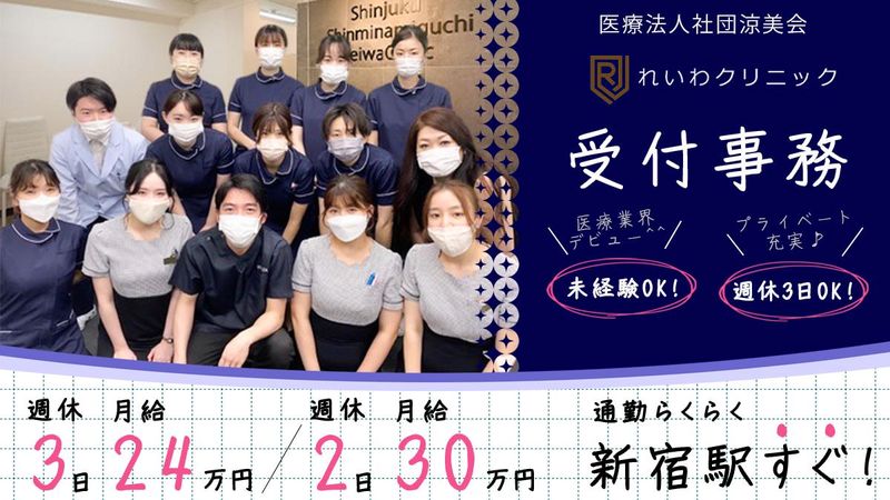 仕事内容 ■クリニックでの受付事務 【業務内容】 ・受付/会計 ・電話応対 ・電子カルテ入力 ・患者様応対 ・予約確認 ・片付け/清掃 \4つのポイント/ ① <ミライナタワー改札から徒歩2分>駅チカ、通勤らくらく!雨でも濡れずに出勤○ ② 未経験でも採用!医療業界でスキルUPして『専門職』になれる! ③ 週休3日制の導入☆出勤は週4日◎やりたい事と両立可能です!! ④ 通勤ラッシュなし!時間が遅いのでゆったりと座って来れます○ ① 新宿駅・ミライナタワー改札から徒歩2分 新宿駅、新南口改札からすぐ目の前の建物が新宿院です。駅から近く通勤はとても快適!また、交通手段も私鉄・JR線など路線が多いので通勤が便利です! ② 医療業界でのスキルアップ可能! 当院で働いている半数以上の方は未経験からスタート!今まで医療事務に興味あったが、なかなか踏み出せなかった人、一度は違う仕事に就いたが、やはり医療業界で働きたかった方など、、、皆さん活躍しております!医療事務として『レセプト』を覚える事が出来れば、医療人としての専門スキルが身につきます! ③ 週休3日制でプライベート充実可能☆ 当院では週休2日と3日の働き方を導入してます。◎週休3日制は勤務が4日だけなので、仕事とプライベートを充実させたい方にお勧めです。習い事や趣味など、自分のやりたい事に時間を使ってメリハリをもって働きたい方にピッタリです!! ④ 朝のラッシュはありません!余裕をもって通勤できます。 当院の開院は平日11時からです。20分前には朝礼がありますが、時間に余裕をもって通勤できます。路線によっては毎日座って来ている職員もおります!煩わしい通勤ラッシュが苦手な方にオススメです!ストレスフリーで通勤できます。 ◇理事長からのメッセージ◇ 当法人では『患者様のために 少しでも ほんの少しでも お役に立ちたい その一心です 全力でサポートさせてください。』との理念をもとに、新宿新南口れいわクリニックをオープンさせました。休日や夜間の時間帯でも通いやすく『患者様にとって便利なクリニック』を目指しておりました。その結果、多くの患者様にご来院いただき、診療所を増やすことができました。それは、私一人の力では到底及ばず、一緒に働いてくださる仲間のおかげで達成するができたと感じております。組織が成功すれば、働く職員もより良い働き方が可能で、経済的にもともに豊かになることができます。これからも、もっと『医療サービス』を世の中に提供して『健やかに過ごせる未来』の創成を目指しております。ぜひ、ご興味のある方、一緒に働きたい方からのご応募をお待ちいたしております!!