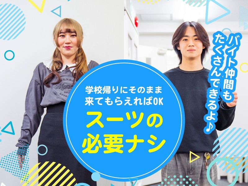 仕事内容 \教育系・語学系志望の文系学生に/ 週1日~OK!時給1270円START♪ 夜は21:25まで&座ってできる◎ “教える力”が身につく塾バイト✨ ❖「伝える力」が磨かれるバイト❖ ―・―・―・―・―・―・―・―・―・―・― 就活や教採に直結するアウトプット力や 論理的に話す力が自然と身につく。 教育・語学系志望者からも圧倒的人気! ───────────────── ……⭐POINTをサクっと紹介⭐…… ───────────────── ✅文系科目(英語・国語だけ)でOK ✅週1日&1日1コマ~勤務可 ✅就活に役立つ指導スキルが身につく ✅私服勤務OK(白衣貸与) ✅交通費全額支給 ✅シフト自由&学業都合に対応 ✅社員割引・食事補助あり ✅友人紹介制度あり ✅面接参加者にギフトカード進呈 ────────────────── ………⭐お仕事内容について⭐……… ────────────────── 小・中・高校生を対象に、 得意な文系科目から気軽にスタート! 自信のある1科目から始められる個別指導♪ ▨教科書やカリキュラムに沿って進行 ▨ホワイトボードで丁寧に解説 ▨生徒の「わからない」に寄り添い ▨一緒に「できた!」を作るお仕事です✨ ✅マンツーマンor1対2の個別スタイル ✅「教える力」が自然に磨かれる ─────────────────── ……⭐未経験でも安心の研修制度⭐…… ─────────────────── ▼応募 ▼本部での面接 ▼校舎での教室長面談 ↪ 校舎の雰囲気や仲間を知った上で 安心して勤務スタートできます◎ ▼本部での入社手続き・研修 ①基礎研修(指導のコツや心構え) ②模擬授業(3回程度) ③検定(合格で研修修了!) ▼校舎研修 先輩講師の授業見学などを経て いよいよ先生デビュー! ⭐いきなり授業を任される心配ナシ! ───────────────── ……⭐働きやすい条件が沢山⭐…… ───────────────── 昇給制度あり+授業外手当も支給。 テスト期間やサークル都合の調整も♪ 夕方~夜だけだから、学業との両立も◎ 私服OK・白衣支給で身だしなみも自由! ───────────────── …⭐進路決定済み高3生も歓迎⭐… ───────────────── 3月中に応募▶面接▶研修で、 4月以降、学校が始まったら 平日週1日・1コマの勤務からOK! 学校と両立しながらバイトにも 少しずつ慣れていけます◎ (時間割決定後のシフト調整もOK) 慣れてきたらシフトを増やして、 夏期講習はがっつり勤務して稼ぐことも◎ ⭐はじめての大学生活の不安を解消 ⭐学校生活もバイトも無理なくスタート