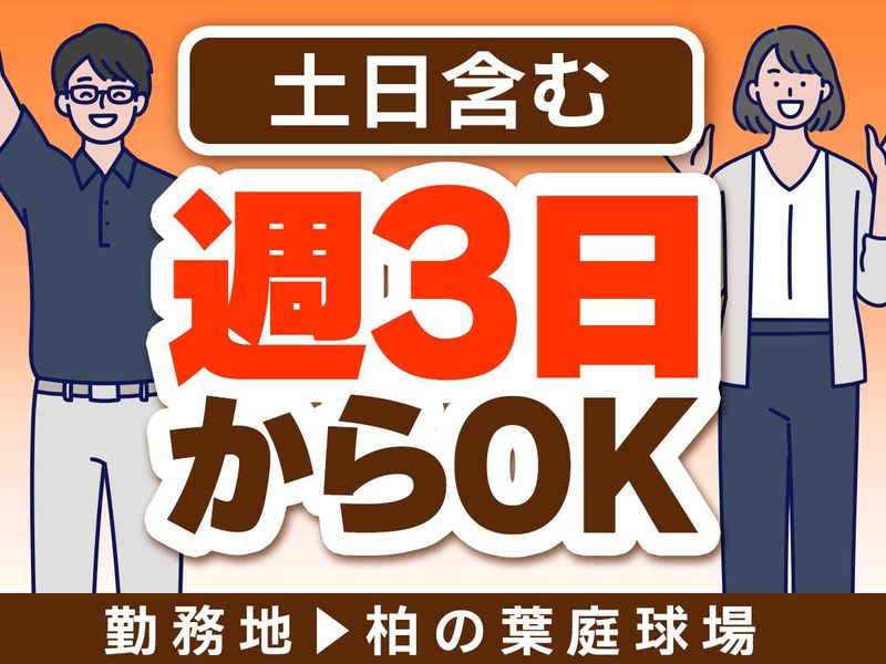 仕事内容 ◆……………………………◆ 未経験&ブランク歓迎♪ 土日含む週3日のお仕事 "公共施設"で安定勤務! ◆……………………………◆ 地域の方々が利用する柏市内の 公共スポーツ施設にて、 管理人スタッフを募集いたします。 <具体的な業務内容> ✅ご利用者様の受付・案内業務 ✅予約管理(PC入力あり) ✅料金徴収 ✅施設内巡回 など \急募★未経験も大歓迎!/  ̄ ̄ ̄ ̄ ̄ ̄ ̄ ̄ ̄ ̄ ̄ ̄ ̄ 基本的なPC操作ができれば 未経験の方も応募OKです♪ 業務の流れなどはイチから丁寧に お教えするので、ご安心ください◎ もちろん、ブランクのある方や 子育てが落ち着いてきて久しぶりの お仕事復帰希望の方も大歓迎✨ \曜日等応相談!WワークOK/  ̄ ̄ ̄ ̄ ̄ ̄ ̄ ̄ ̄ ̄ ̄ ̄ ̄ ̄ 月曜から日曜の間で週3日程度、 朝から夕方までの時間帯で 業務をお任せいたします。 「別のお仕事と掛け持ちでWワーク」 「土日メインで働きたい」 という方にもオススメです♪ - 【 勤務地 】 柏の葉庭球場 住所:千葉県柏市柏の葉6丁目7 *柏駅西口より柏の葉公園行きバスで 「柏の葉高校前」下車、徒歩15分 *マイカー通勤OK 柏市内にお住まいの方だけでなく、 松戸市、白井市、印西市、取手市 などから通勤されている方も活躍中! -