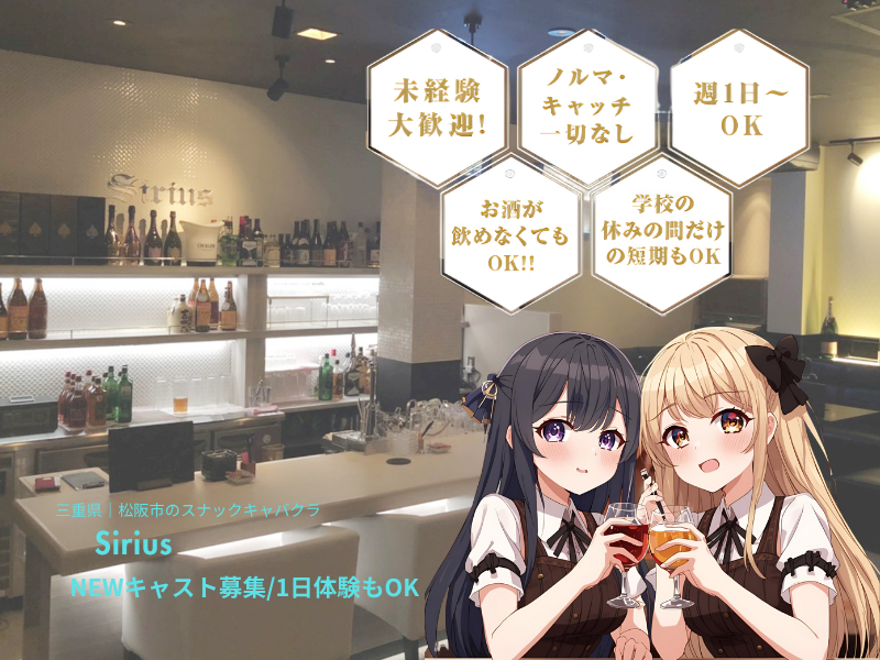 仕事内容 お酒が飲めなくてもOK!連絡先交換なし★(’v’* 売上ノルマやビラ配りなどの営業もなくて楽ちん♪ ー 〇まずは体験入店だけでもご応募OKです✨ ⭐頑張る女性応援キャンペーン⭐ 入店祝金5万円&体験入店も時給3000円 学生や家事・育児、昼職と両立している方も多いです! お仕事の詳細*’v’)★ ー ①フロアレディ[お客さまへの接客] ⏩時給3000円以上 週1日からOK ⏰20:30~1:00/途中から勤務や終電までもOK! たのしくお話しながらオーダーをとったり、 お酒を作ったりとむずかしい仕事はありません! あなたはソフトドリンクで大丈夫ですよ♪ Instagram https://www.instagram.com/sirius3728/ ナイトスクープ ”お店の詳細Check” https://nightscoop.jp/sirius/ ②ガール[女性の黒服さん] ⏩時給1500円~ 昇給・手当てあり ⏰20:30~1:00/週1日以上・3時間からOK ②ボーイ ⏩時給1300円~ 昇給・手当てあり ⏰20:30~1:00/週1日以上・3時間からOK お客さまのご案内・オーダー取り・灰皿の交換・ お会計・店内清掃などホール業務全般をお任せします! 免許をお持ちの方は、女の子の送迎もお願いします_(._.)_ 忙しくて出勤できない週があっても大丈夫です! どちらもプライベートに合わせて勤務できます(*'▽') ⭐体験時間 3時間 給与 9,000円⭐ ー ◆体験時給3,000円◆ 3時間で設定していますが短くても長くてもOK ●体験の内容 お酒を作ってみたり、お客さまと楽しくおしゃべりしたり! 先輩メンバーのお手伝いなので、ひとりになる心配なし♪ 当日は、年齢が確認できるものをご用意くださいm(_ _)m ー お店の場所がわからない方は記載の電話番号までご連絡下さい! すぐにお迎えに上がります(・ω・)ノ TEL:080₋1442₋5903/採用担当 0598-21-6776/店舗 〒515₋0037 三重県松阪市愛宕町3丁目11 愛宕パートビルⅡ 1F